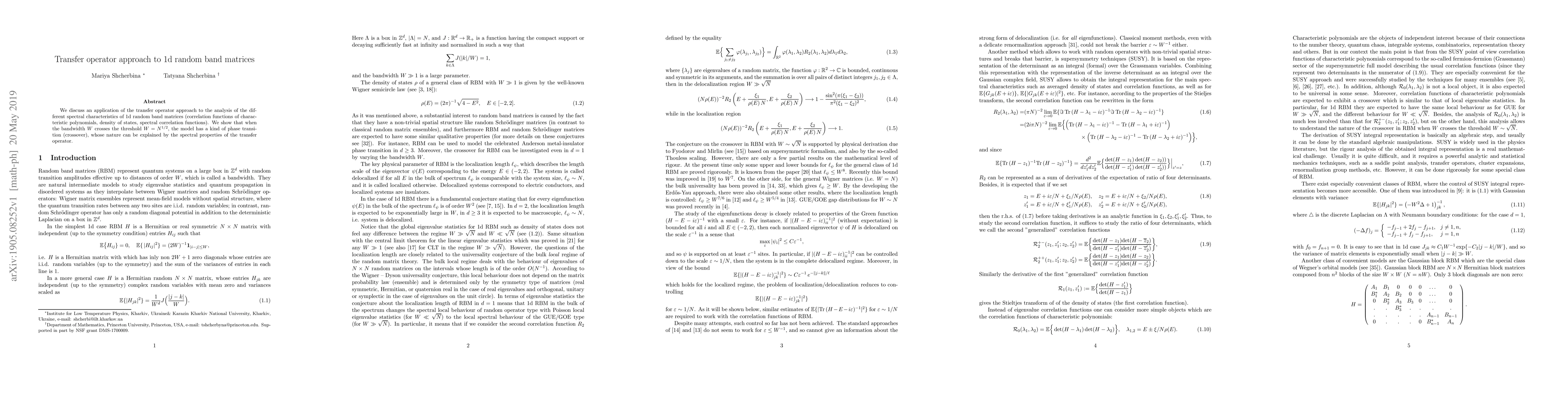 The paper employs the transfer operator approach to analyze spectral characteristics of 1d random band matrices, revealing a phase transition when bandwidth crosses $W=N^{1/2}$, explained by the spectral properties of the transfer operator. This transition affects correlation functions, density of states, and spectral correlation functions.