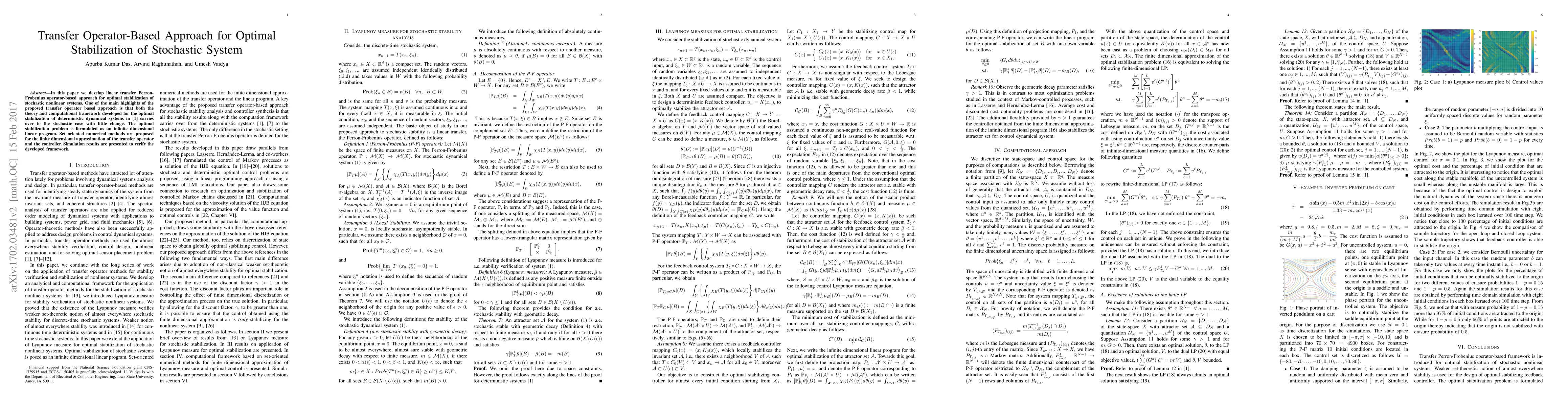 In this paper we develop linear transfer Perron Frobenius operator-based approach for optimal stabilization of stochastic nonlinear system. One of the main highlight of the proposed transfer operator based approach is that both the theory and computational framework developed for the optimal stabilization of deterministic dynamical system in [1] carries over to the stochastic case with little change. The optimal stabilization problem is formulated as an infinite dimensional linear program. Set oriented numerical methods are proposed for the finite dimensional approximation of the transfer operator and the controller. Simulation results are presented to verify the developed framework.
