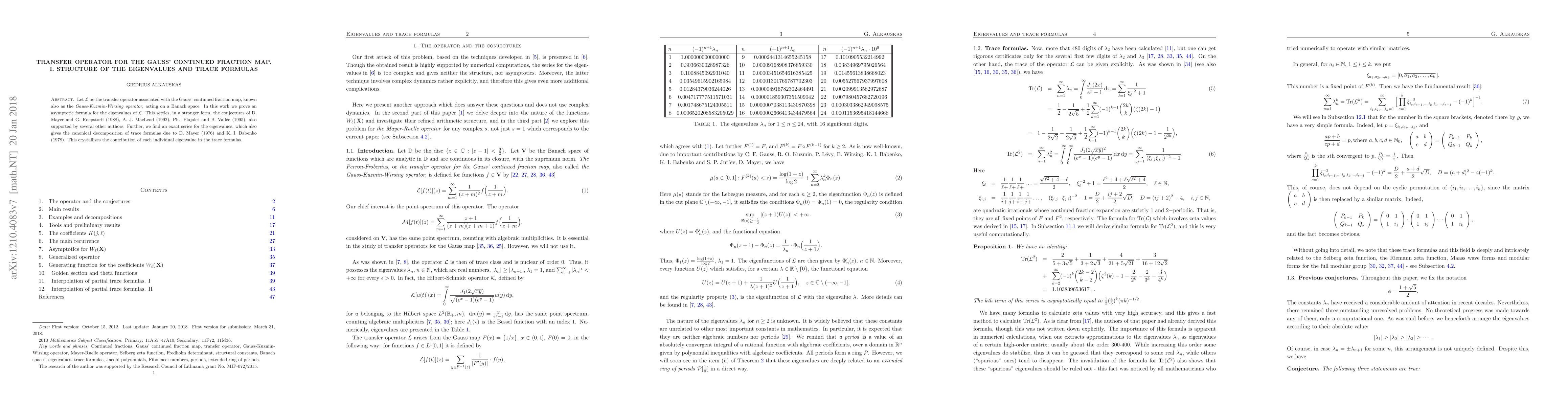 Let L be the transfer operator associated with the Gauss' continued fraction map, known also as the Gauss-Kuzmin-Wirsing operator, acting on the Banach space. In this work we prove an asymptotic formula for the eigenvalues of L. This settles, in a stronger form, the conjectures of D. Mayer and G. Roepstorff (1988), A.J. MacLeod (1992), Ph. Flajolet and B. Vallee (1995), also supported by several other authors. Further, we find an exact series for the eigenvalues, which also gives the canonical decomposition of trace formulas due to D. Mayer (1976) and K.I. Babenko (1978). This crystallizes the contribution of each individual eigenvalue in the trace formulas.