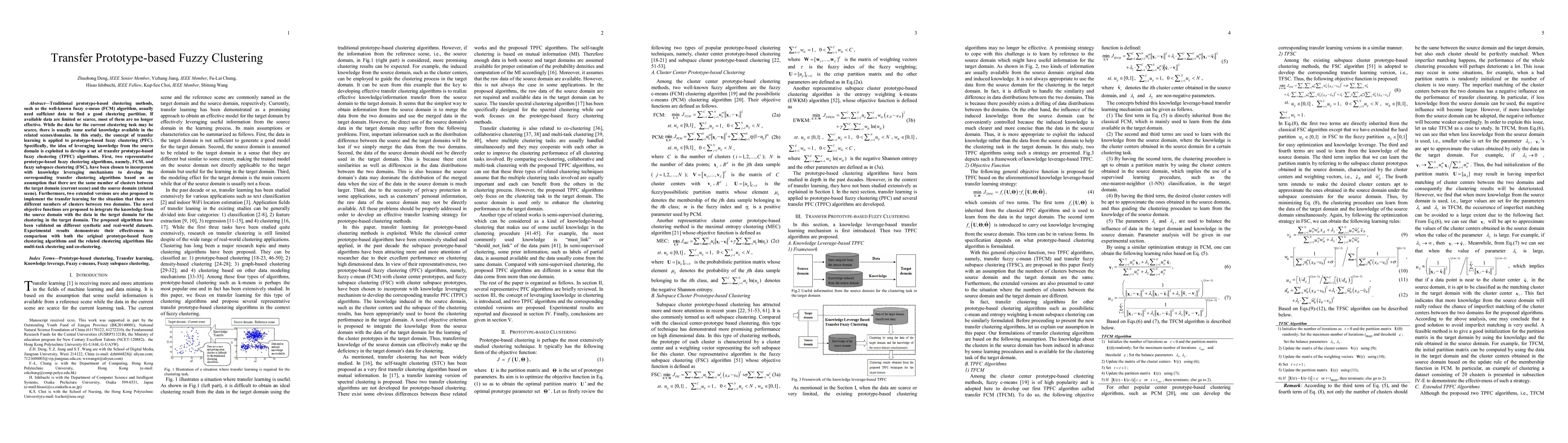 This paper proposes transfer prototype-based fuzzy clustering (TPFC) algorithms that leverage knowledge from related domains to enhance clustering performance when target data is limited. The study develops TPFC versions of FCM, FKPC, and FSC, and validates their effectiveness on synthetic and real-world datasets, showing improved results compared to original and related clustering methods.