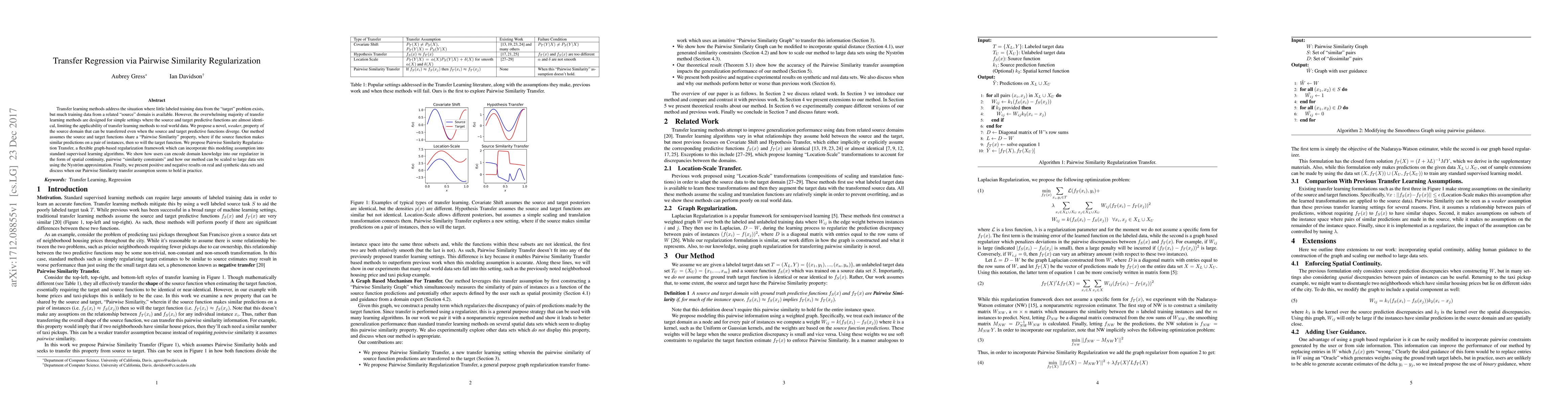 This paper introduces Pairwise Similarity Regularization Transfer, a novel transfer learning method that leverages the Pairwise Similarity assumption between source and target domains, enabling effective knowledge transfer even when predictive functions diverge. The method scales to large datasets and incorporates domain knowledge through spatial continuity and similarity constraints.