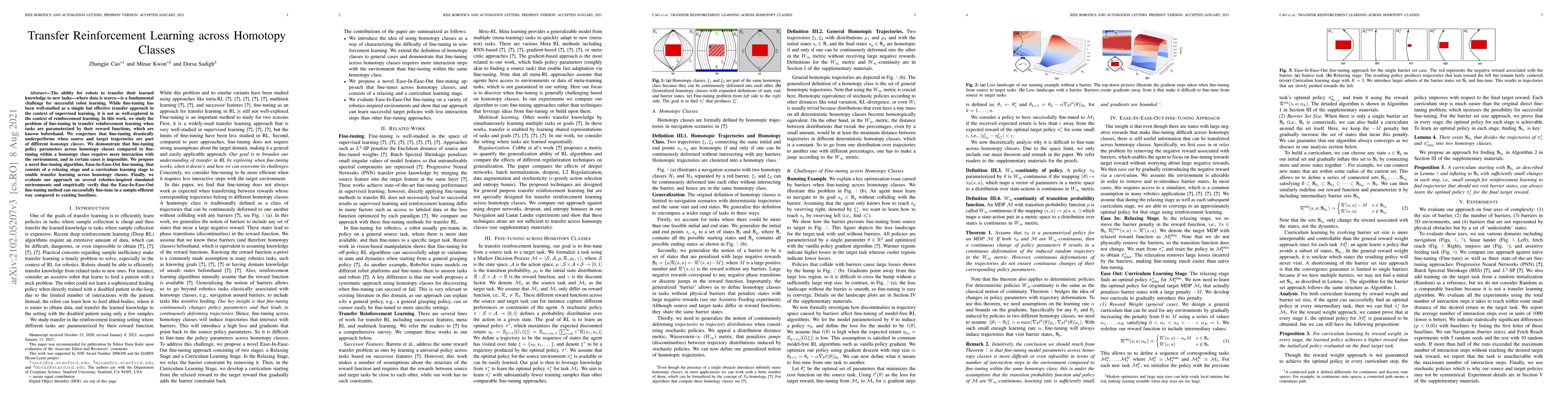 This paper investigates the challenge of transferring reinforcement learning knowledge across different homotopy classes, proposing a novel fine-tuning algorithm called Ease-In-Ease-Out fine-tuning that combines a relaxing stage and curriculum learning to enable efficient transfer learning across homotopy classes, outperforming existing methods.
