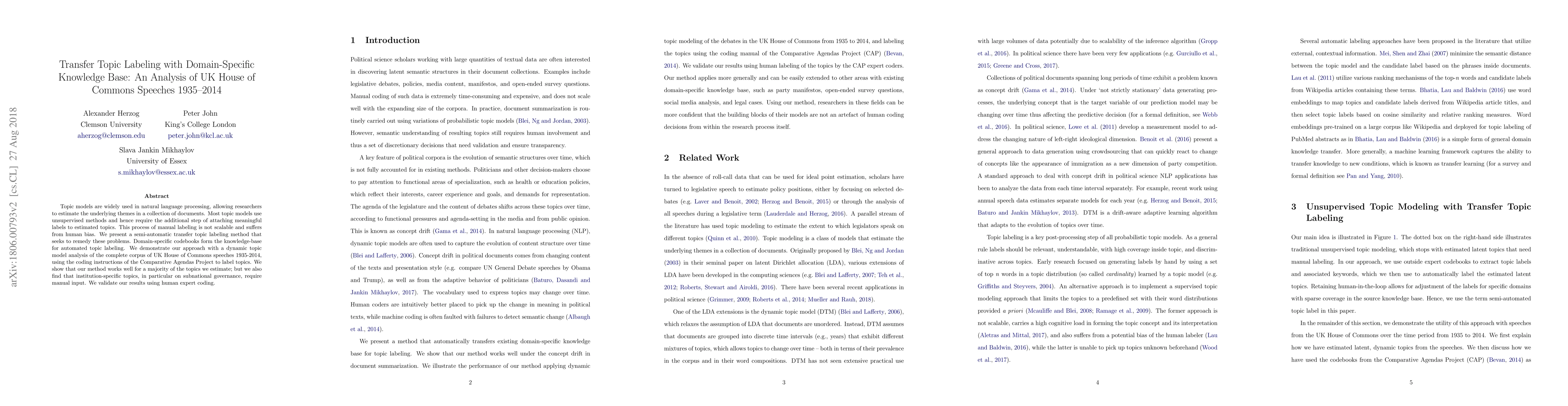 This paper proposes a semi-automatic method for transfer topic labeling using domain-specific knowledge bases, demonstrated through a dynamic topic model analysis of UK House of Commons speeches from 1935-2014. While the method largely automates topic labeling, it still requires manual input for institution-specific topics, particularly those related to subnational governance, validated by human expert coding.