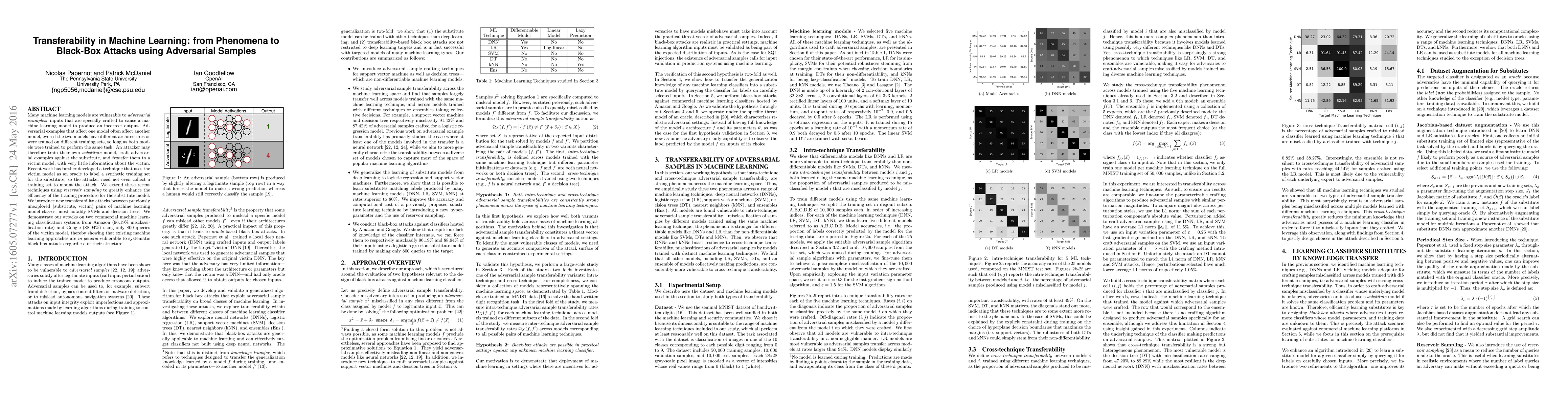 Many machine learning models are vulnerable to adversarial examples: inputs that are specially crafted to cause a machine learning model to produce an incorrect output. Adversarial examples that affect one model often affect another model, even if the two models have different architectures or were trained on different training sets, so long as both models were trained to perform the same task. An attacker may therefore train their own substitute model, craft adversarial examples against the substitute, and transfer them to a victim model, with very little information about the victim. Recent work has further developed a technique that uses the victim model as an oracle to label a synthetic training set for the substitute, so the attacker need not even collect a training set to mount the attack. We extend these recent techniques using reservoir sampling to greatly enhance the efficiency of the training procedure for the substitute model. We introduce new transferability attacks between previously unexplored (substitute, victim) pairs of machine learning model classes, most notably SVMs and decision trees. We demonstrate our attacks on two commercial machine learning classification systems from Amazon (96.19% misclassification rate) and Google (88.94%) using only 800 queries of the victim model, thereby showing that existing machine learning approaches are in general vulnerable to systematic black-box attacks regardless of their structure.