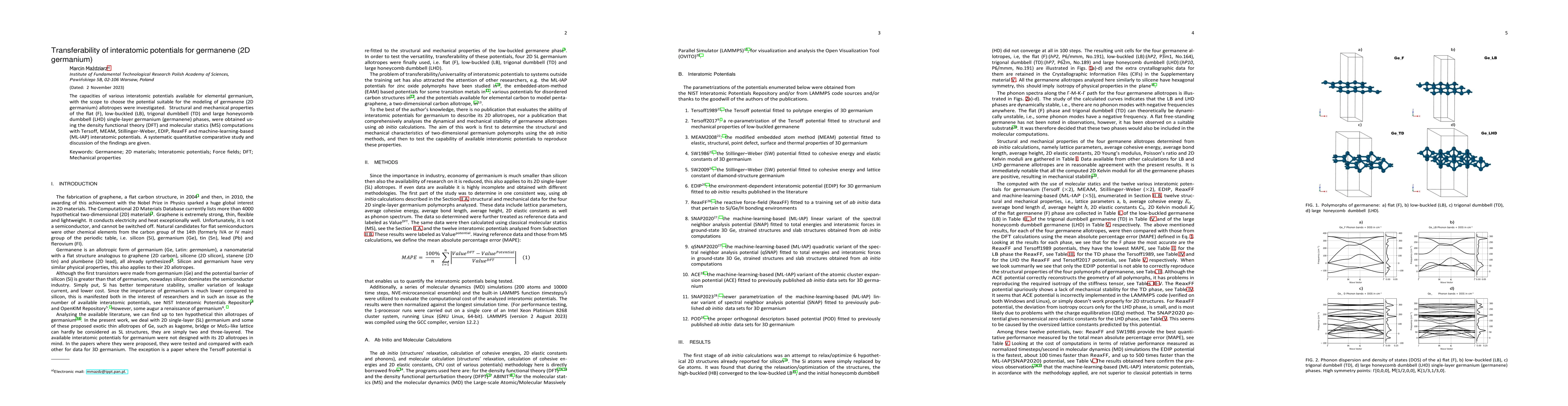 The capacities of various interatomic potentials available for elemental germanium, with the scope to choose the potential suitable for the modeling of germanene (2D germanium) allotropes were investigated. Structural and mechanical properties of the flat (F), low-buckled (LB), trigonal dumbbell (TD) and large honeycomb dumbbell (LHD) single-layer germanium (germanene) phases, were obtained using the density functional theory (DFT) and molecular statics (MS) computations with Tersoff, MEAM, Stillinger-Weber, EDIP, ReaxFF and machine-learning-based (ML-IAP) interatomic potentials. A systematic quantitative comparative study and discussion of the findings are given.