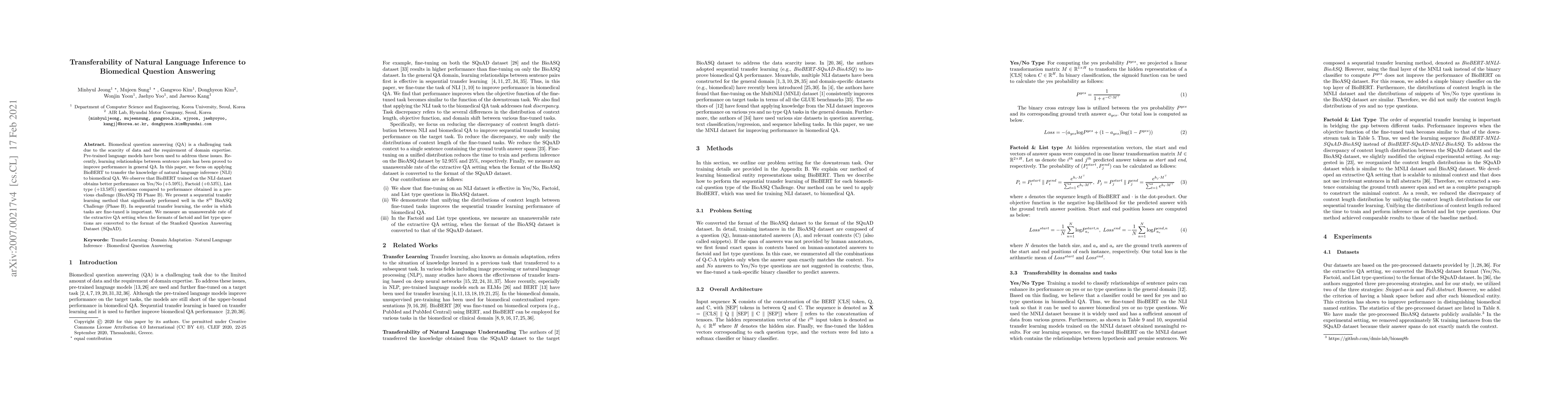 This paper explores using BioBERT to transfer natural language inference (NLI) knowledge to biomedical question answering (QA), achieving better performance on various question types. The study introduces a sequential transfer learning method that significantly improves results in the 8th BioASQ Challenge, highlighting the importance of task fine-tuning order.
