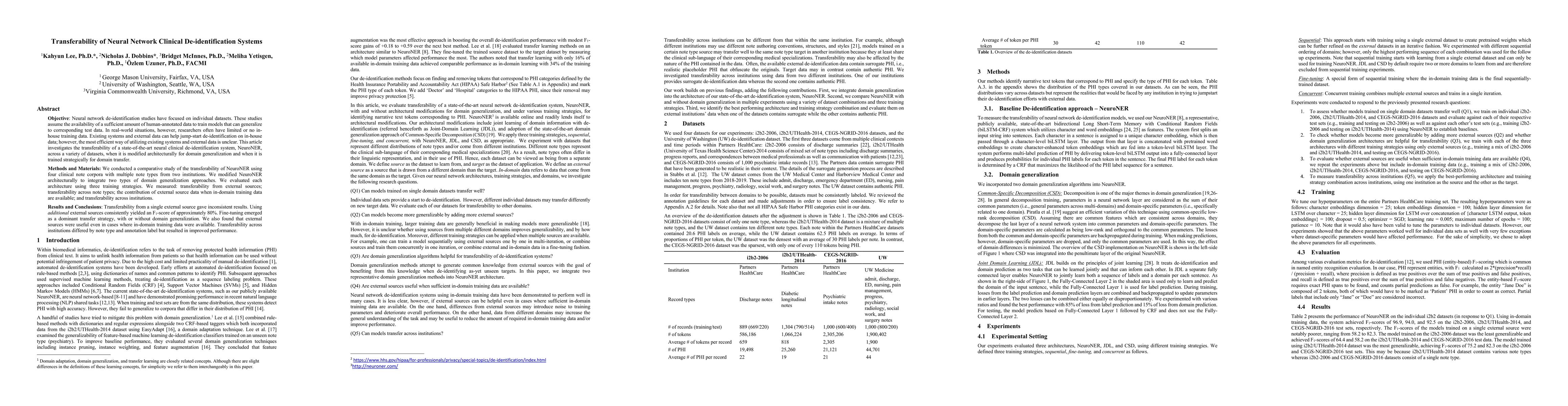 This study investigates the transferability of the NeuroNER neural network system for clinical de-identification across different datasets. Fine-tuning emerged as the most effective transfer strategy, even when supplemented with domain generalization, and external data sources significantly improved performance even when in-domain training data were available.