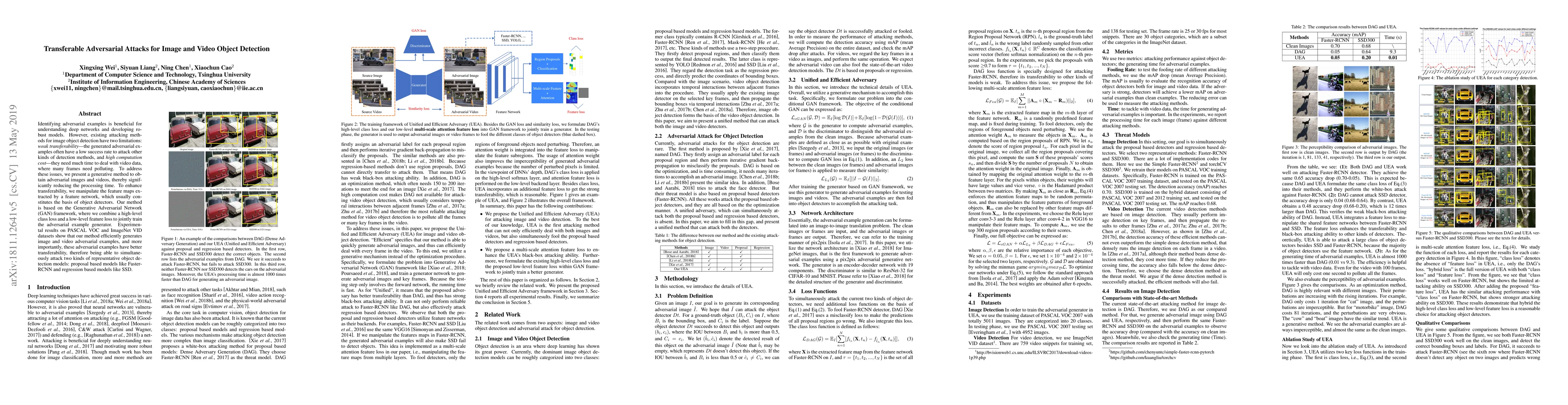 Adversarial examples have been demonstrated to threaten many computer vision tasks including object detection. However, the existing attacking methods for object detection have two limitations: poor transferability, which denotes that the generated adversarial examples have low success rate to attack other kinds of detection methods, and high computation cost, which means that they need more time to generate an adversarial image, and therefore are difficult to deal with the video data. To address these issues, we utilize a generative mechanism to obtain the adversarial image and video. In this way, the processing time is reduced. To enhance the transferability, we destroy the feature maps extracted from the feature network, which usually constitutes the basis of object detectors. The proposed method is based on the Generative Adversarial Network (GAN) framework, where we combine the high-level class loss and low-level feature loss to jointly train the adversarial example generator. A series of experiments conducted on PASCAL VOC and ImageNet VID datasets show that our method can efficiently generate image and video adversarial examples, and more importantly, these adversarial examples have better transferability, and thus, are able to simultaneously attack two kinds of representative object detection models: proposal based models like Faster-RCNN, and regression based models like SSD.