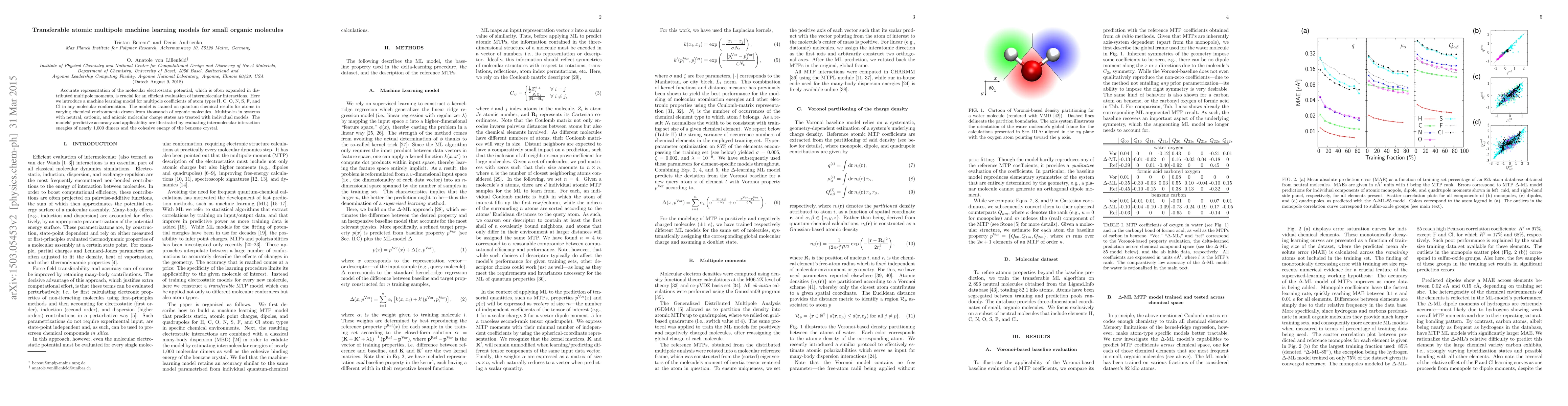 This paper presents machine learning models for predicting multipole coefficients of small organic molecules, trained on quantum chemical data. The models demonstrate high accuracy in evaluating intermolecular interaction energies and cohesive energies for various molecular charge states.