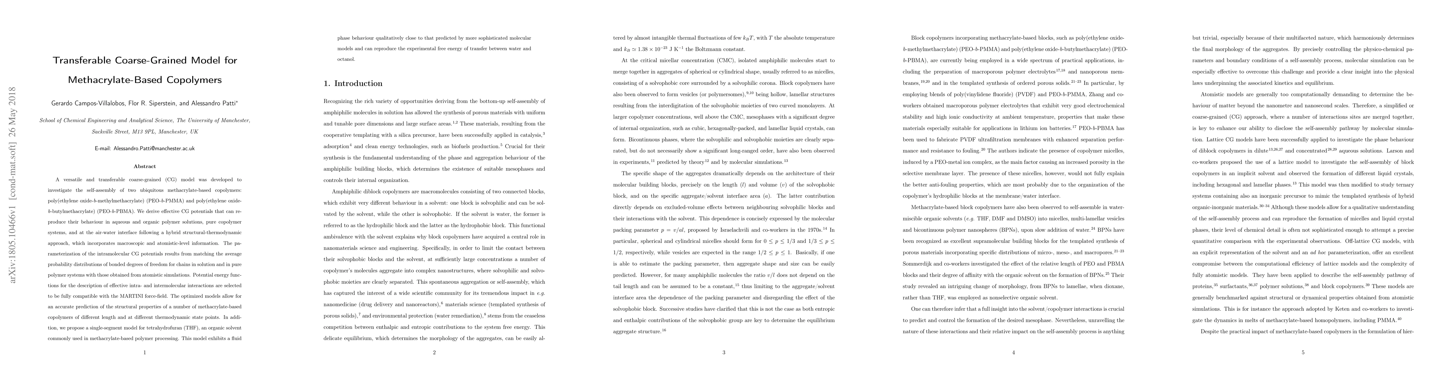 This paper develops a transferable coarse-grained model for methacrylate-based copolymers, enabling accurate predictions of self-assembly behaviors in various environments. The model is compatible with the MARTINI force-field and accurately predicts structural properties across different copolymer lengths and conditions.