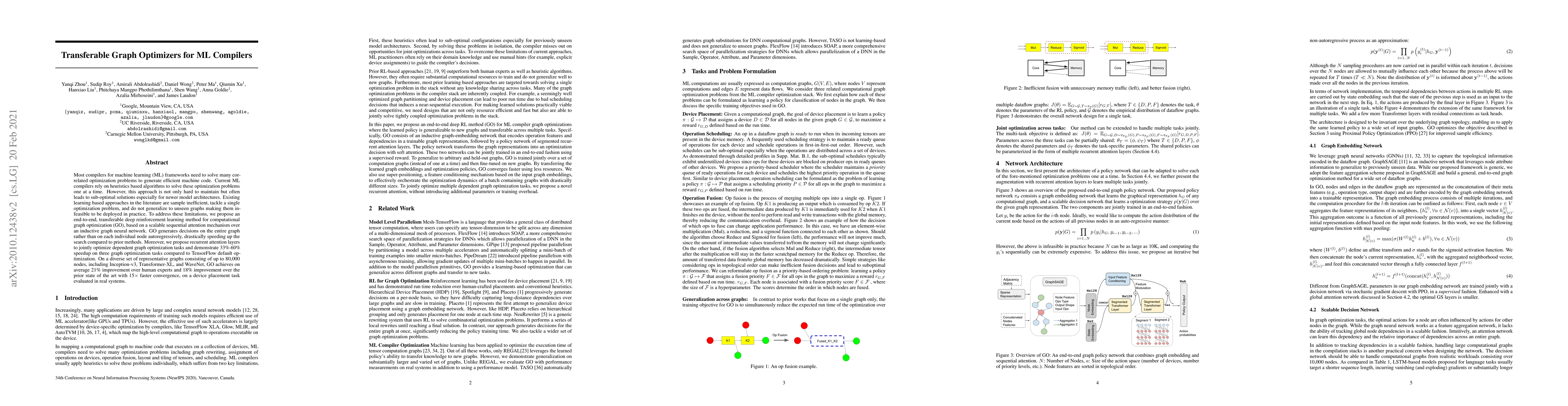 This paper proposes a transferable graph optimizer for ML compilers using deep reinforcement learning to optimize computational graphs efficiently. The method achieves significant speedups and improvements over existing techniques and human experts, demonstrating its effectiveness for diverse graph optimization tasks.