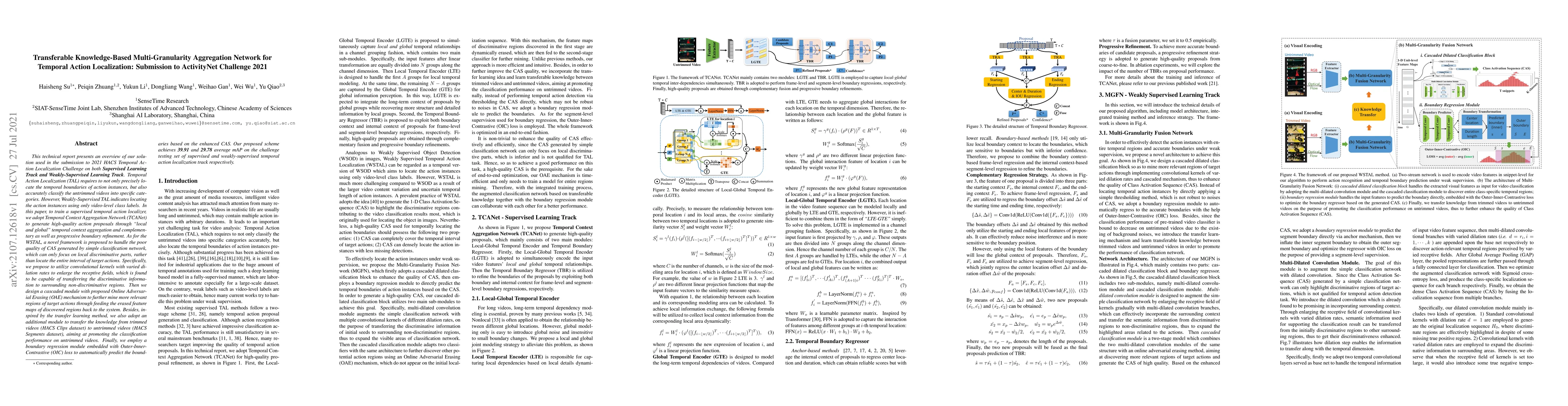 This technical report presents an overview of our solution used in the submission to 2021 HACS Temporal Action Localization Challenge on both Supervised Learning Track and Weakly-Supervised Learning Track. Temporal Action Localization (TAL) requires to not only precisely locate the temporal boundaries of action instances, but also accurately classify the untrimmed videos into specific categories. However, Weakly-Supervised TAL indicates locating the action instances using only video-level class labels. In this paper, to train a supervised temporal action localizer, we adopt Temporal Context Aggregation Network (TCANet) to generate high-quality action proposals through ``local and global" temporal context aggregation and complementary as well as progressive boundary refinement. As for the WSTAL, a novel framework is proposed to handle the poor quality of CAS generated by simple classification network, which can only focus on local discriminative parts, rather than locate the entire interval of target actions. Further inspired by the transfer learning method, we also adopt an additional module to transfer the knowledge from trimmed videos (HACS Clips dataset) to untrimmed videos (HACS Segments dataset), aiming at promoting the classification performance on untrimmed videos. Finally, we employ a boundary regression module embedded with Outer-Inner-Contrastive (OIC) loss to automatically predict the boundaries based on the enhanced CAS. Our proposed scheme achieves 39.91 and 29.78 average mAP on the challenge testing set of supervised and weakly-supervised temporal action localization track respectively.