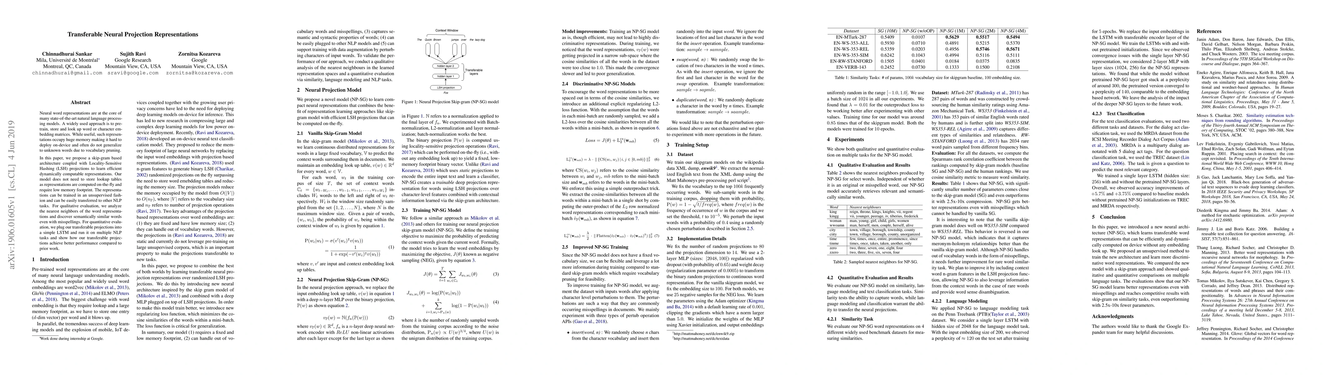 This paper proposes a skip-gram architecture with Locality-Sensitive Hashing projections to create efficient, on-the-fly neural word representations that require minimal memory and generalize well. The model outperforms prior methods in various NLP tasks, demonstrating its transferability and effectiveness.