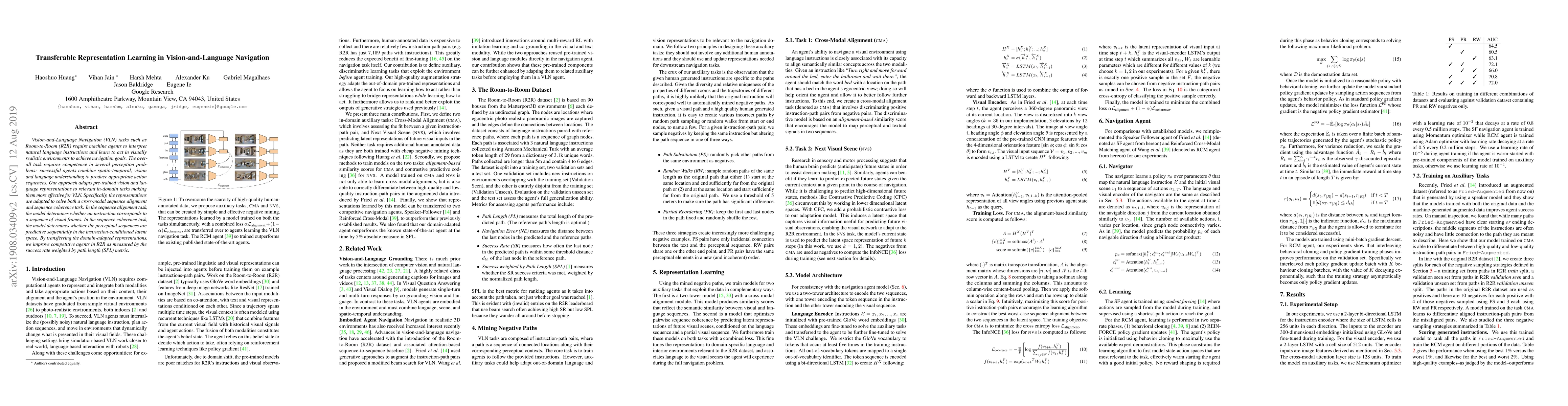 Vision-and-Language Navigation (VLN) tasks such as Room-to-Room (R2R) require machine agents to interpret natural language instructions and learn to act in visually realistic environments to achieve navigation goals. The overall task requires competence in several perception problems: successful agents combine spatio-temporal, vision and language understanding to produce appropriate action sequences. Our approach adapts pre-trained vision and language representations to relevant in-domain tasks making them more effective for VLN. Specifically, the representations are adapted to solve both a cross-modal sequence alignment and sequence coherence task. In the sequence alignment task, the model determines whether an instruction corresponds to a sequence of visual frames. In the sequence coherence task, the model determines whether the perceptual sequences are predictive sequentially in the instruction-conditioned latent space. By transferring the domain-adapted representations, we improve competitive agents in R2R as measured by the success rate weighted by path length (SPL) metric.