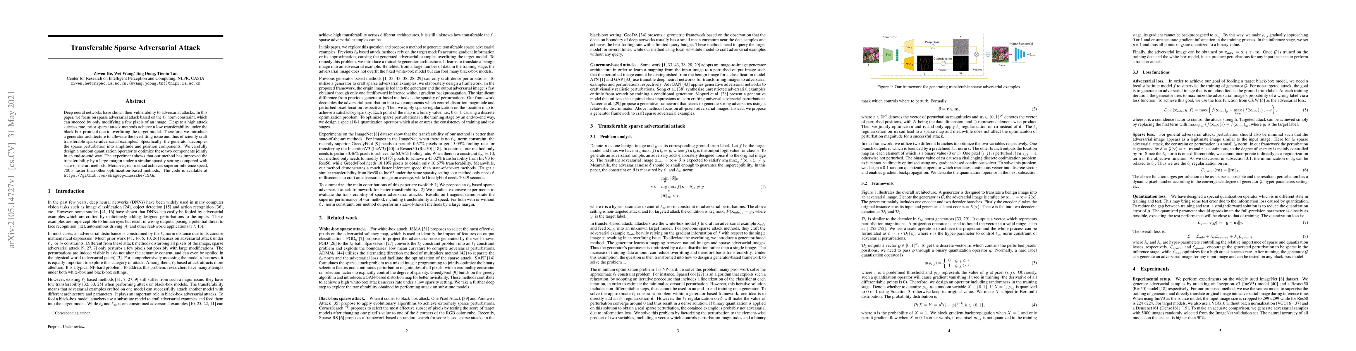 This paper proposes a new generator architecture to create transferable sparse adversarial attacks with a focus on the $\ell_0$ norm constraint. The method improves transferability by decoupling perturbation into amplitude and position components, optimizing them jointly, and achieving a 700× faster inference speed compared to other methods.