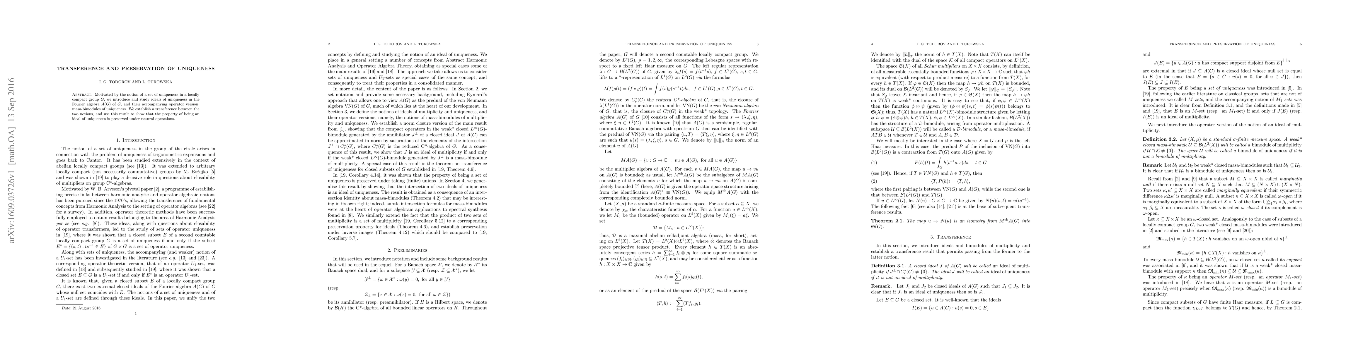 A research paper explores the concept of uniqueness in locally compact groups and their Fourier algebras, establishing a transference between ideals of uniqueness and masa-bimodules, which preserves properties under natural operations.