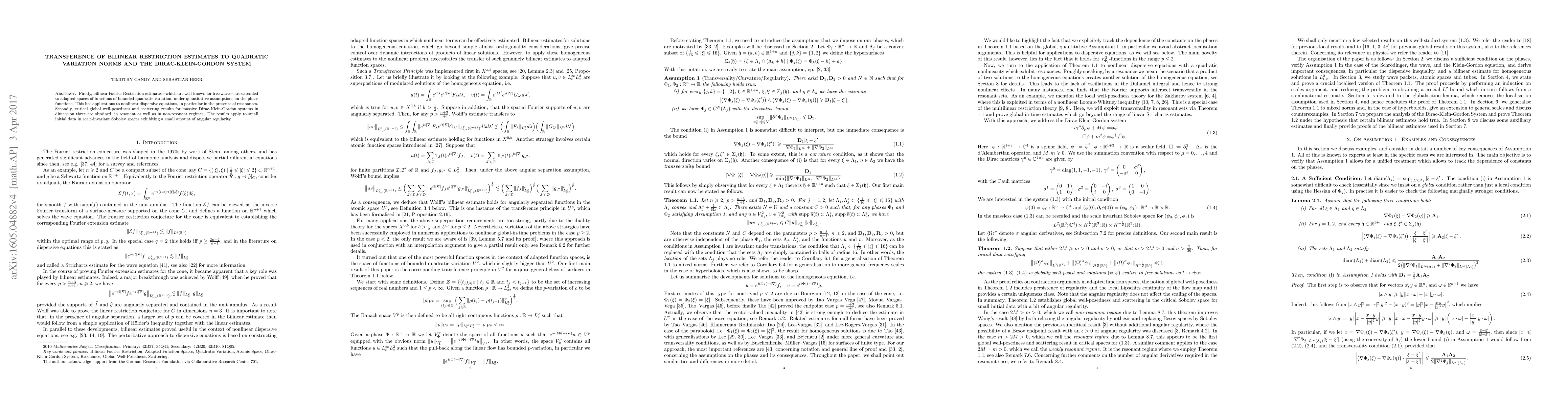 This paper extends bilinear Fourier Restriction estimates to functions of bounded quadratic variation, with implications for nonlinear dispersive equations. It also establishes critical global well-posedness and scattering for massive Dirac-Klein-Gordon systems in three dimensions, under both resonant and non-resonant conditions.