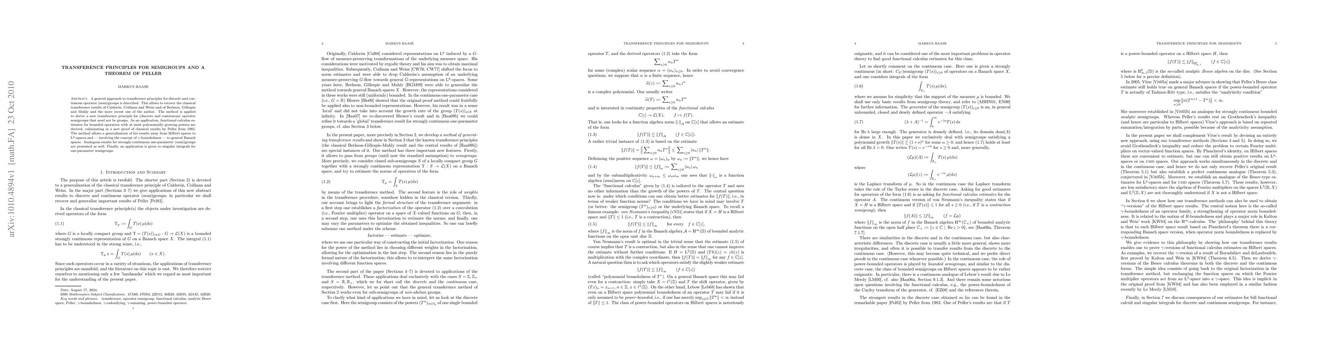 This paper develops a new transference principle for operator (semi)groups, extending classical results and applying it to derive functional calculus estimates for bounded operators with polynomial growth. It generalizes Peller's 1982 results from Hilbert spaces to $\Ell{p}$-spaces and Banach spaces, and extends findings to singular integrals.