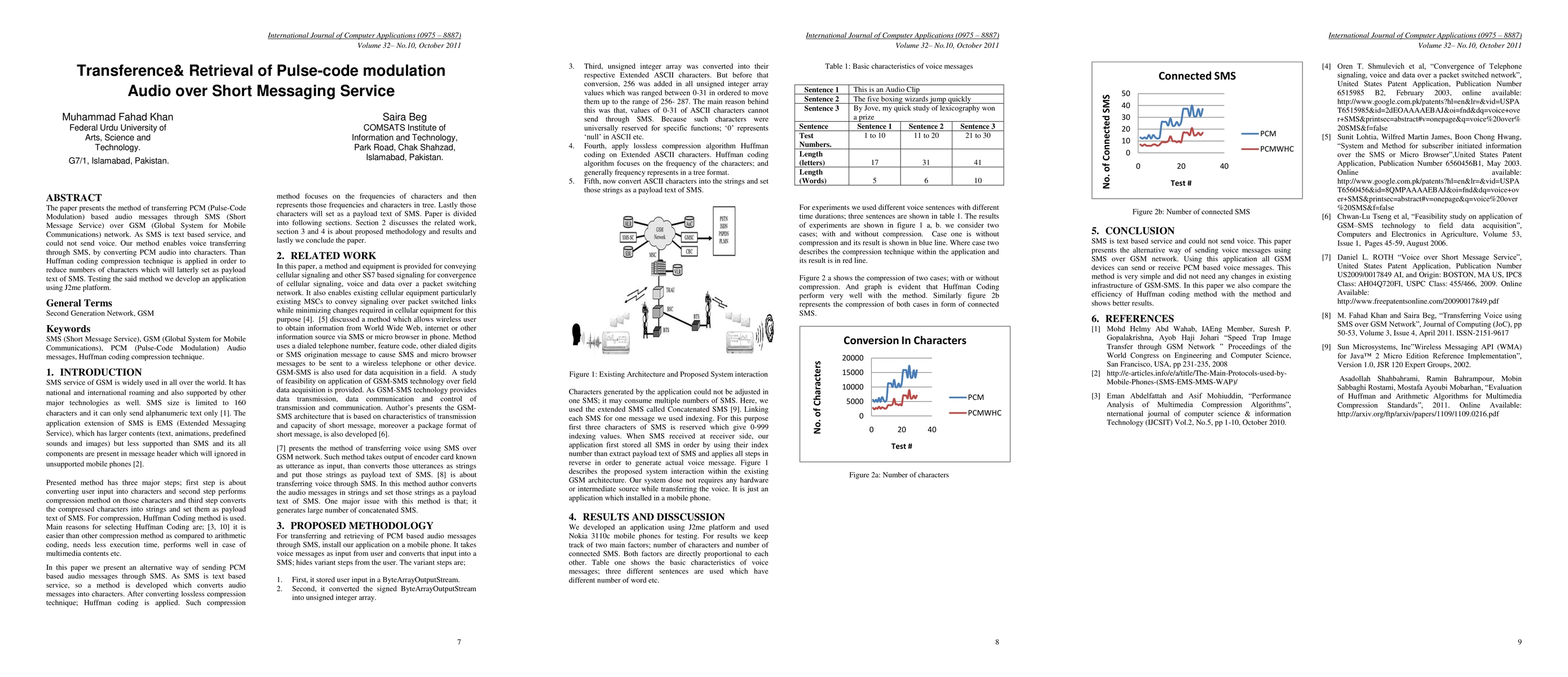 This paper details a method for transferring PCM audio via SMS by converting PCM to characters and applying Huffman coding for compression, enabling voice message delivery over GSM networks. An application developed using the J2me platform was tested to validate this approach.