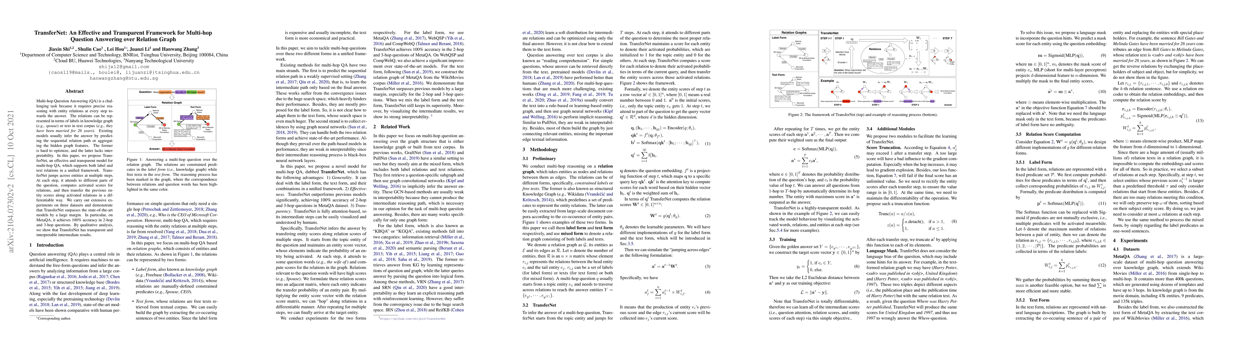 TransferNet is a novel framework for multi-hop question answering that effectively handles both label and text relations. It achieves superior performance and interpretability by attending to question parts, computing activated scores, and transferring entity scores across relations in a differentiable manner.