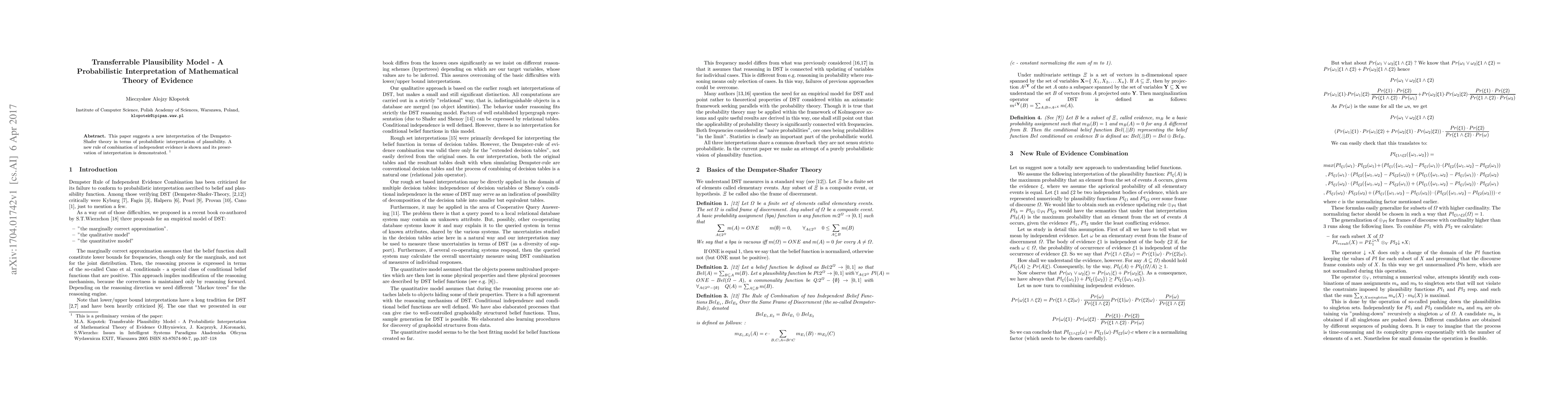 This paper suggests a new interpretation of the Dempster-Shafer theory in terms of probabilistic interpretation of plausibility. A new rule of combination of independent evidence is shown and its preservation of interpretation is demonstrated.