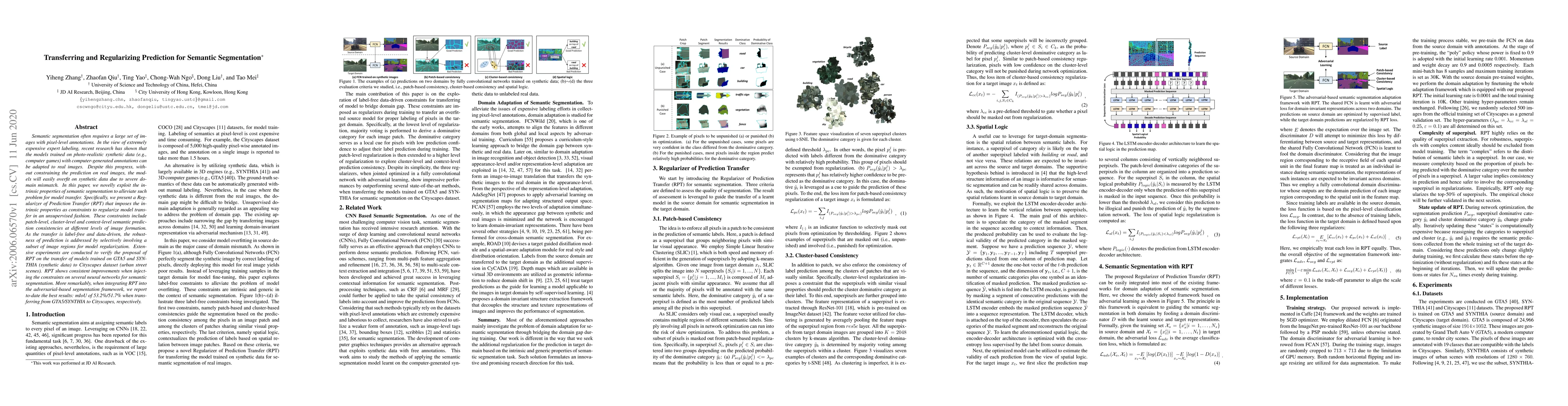 This paper proposes a Regularizer of Prediction Transfer (RPT) to address overfitting in semantic segmentation models trained on synthetic data when applied to real images. RPT imposes intrinsic semantic constraints in an unsupervised manner, improving model transfer from synthetic to real datasets, achieving state-of-the-art results with a mean Intersection over Union (mIoU) of 53.2% and 51.7% for GTA5 and SYNTHIA to Cityscapes transfers, respectively.