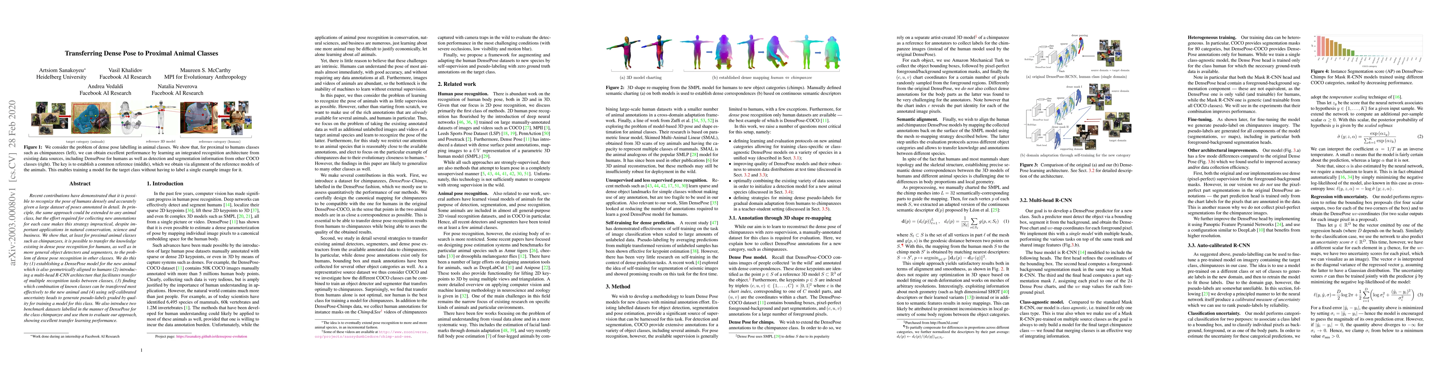 Recent contributions have demonstrated that it is possible to recognize the pose of humans densely and accurately given a large dataset of poses annotated in detail. In principle, the same approach could be extended to any animal class, but the effort required for collecting new annotations for each case makes this strategy impractical, despite important applications in natural conservation, science and business. We show that, at least for proximal animal classes such as chimpanzees, it is possible to transfer the knowledge existing in dense pose recognition for humans, as well as in more general object detectors and segmenters, to the problem of dense pose recognition in other classes. We do this by (1) establishing a DensePose model for the new animal which is also geometrically aligned to humans (2) introducing a multi-head R-CNN architecture that facilitates transfer of multiple recognition tasks between classes, (3) finding which combination of known classes can be transferred most effectively to the new animal and (4) using self-calibrated uncertainty heads to generate pseudo-labels graded by quality for training a model for this class. We also introduce two benchmark datasets labelled in the manner of DensePose for the class chimpanzee and use them to evaluate our approach, showing excellent transfer learning performance.