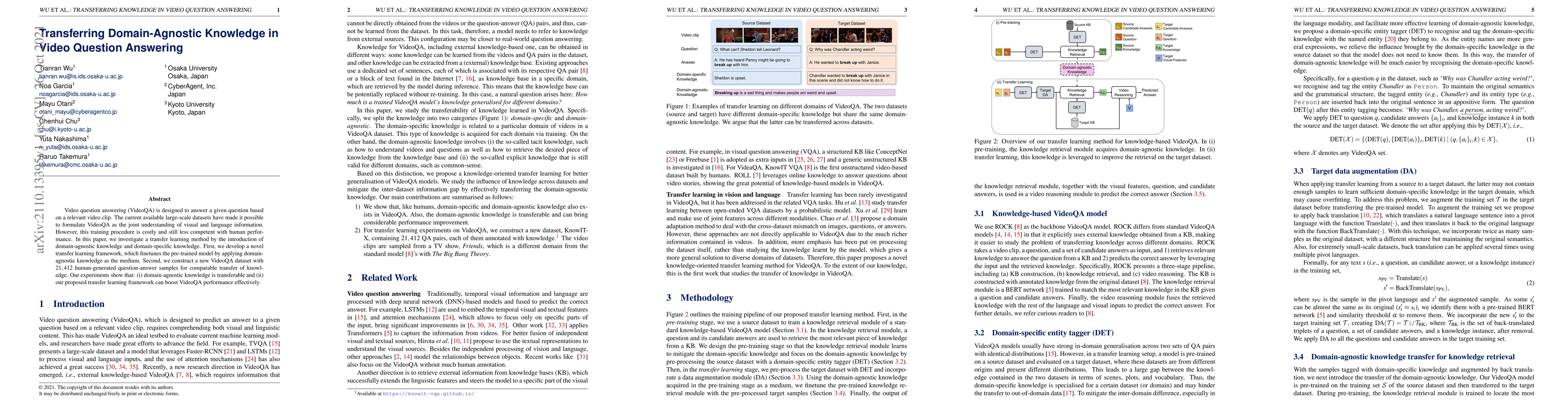 This paper explores a transfer learning method for video question answering (VideoQA) by integrating domain-agnostic and domain-specific knowledge. The authors propose a novel framework that finetunes pre-trained models using domain-agnostic knowledge, and demonstrate improved performance through a newly constructed VideoQA dataset.