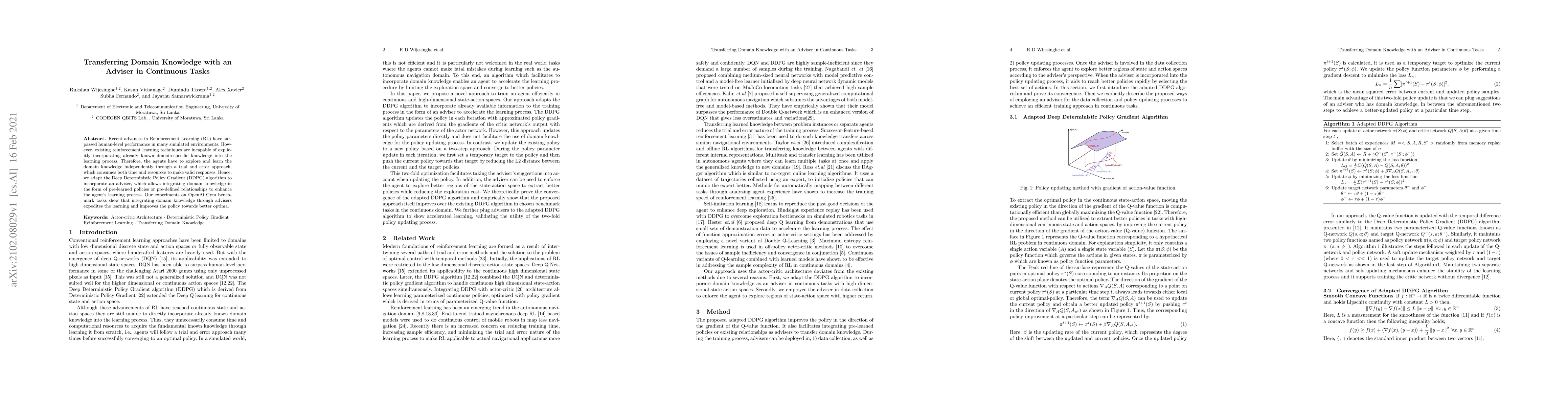 Recent advances in Reinforcement Learning (RL) have surpassed human-level performance in many simulated environments. However, existing reinforcement learning techniques are incapable of explicitly incorporating already known domain-specific knowledge into the learning process. Therefore, the agents have to explore and learn the domain knowledge independently through a trial and error approach, which consumes both time and resources to make valid responses. Hence, we adapt the Deep Deterministic Policy Gradient (DDPG) algorithm to incorporate an adviser, which allows integrating domain knowledge in the form of pre-learned policies or pre-defined relationships to enhance the agent's learning process. Our experiments on OpenAi Gym benchmark tasks show that integrating domain knowledge through advisers expedites the learning and improves the policy towards better optima.