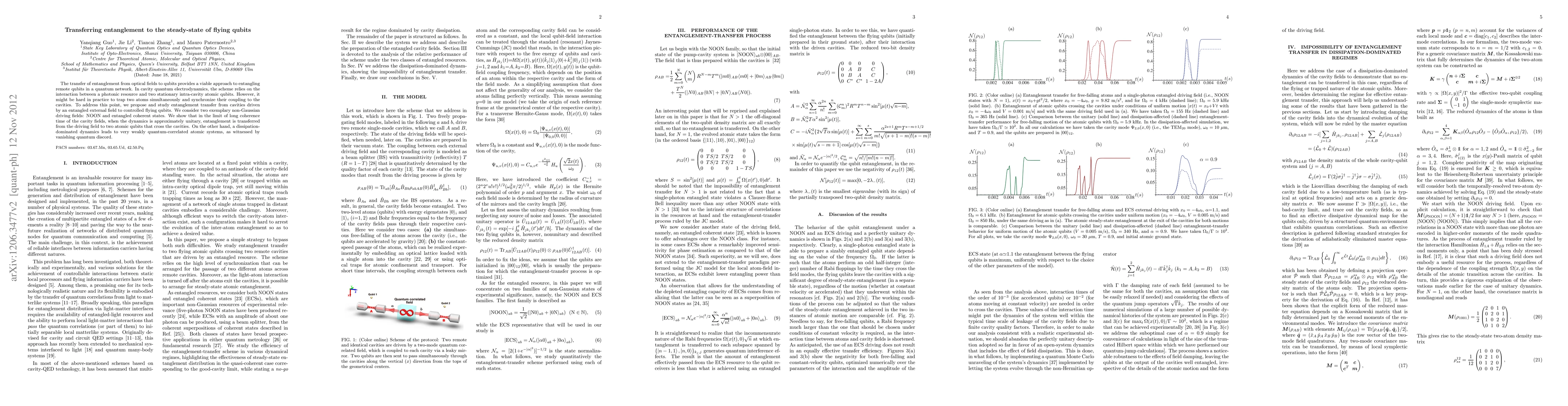 The transfer of entanglement from optical fields to qubits provides a viable approach to entangling remote qubits in a quantum network. In cavity quantum electrodynamics, the scheme relies on the interaction between a photonic resource and two stationary intracavity atomic qubits. However, it might be hard in practice to trap two atoms simultaneously and synchronize their coupling to the cavities. To address this point, we propose and study entanglement transfer from cavities driven by an entangled external field to controlled flying qubits. We consider two exemplary non-Gaussian driving fields: NOON and entangled coherent states. We show that in the limit of long coherence time of the cavity fields, when the dynamics is approximately unitary, entanglement is transferred from the driving field to two atomic qubits that cross the cavities. On the other hand, a dissipation-dominated dynamics leads to very weakly quantum-correlated atomic systems, as witnessed by vanishing quantum discord.