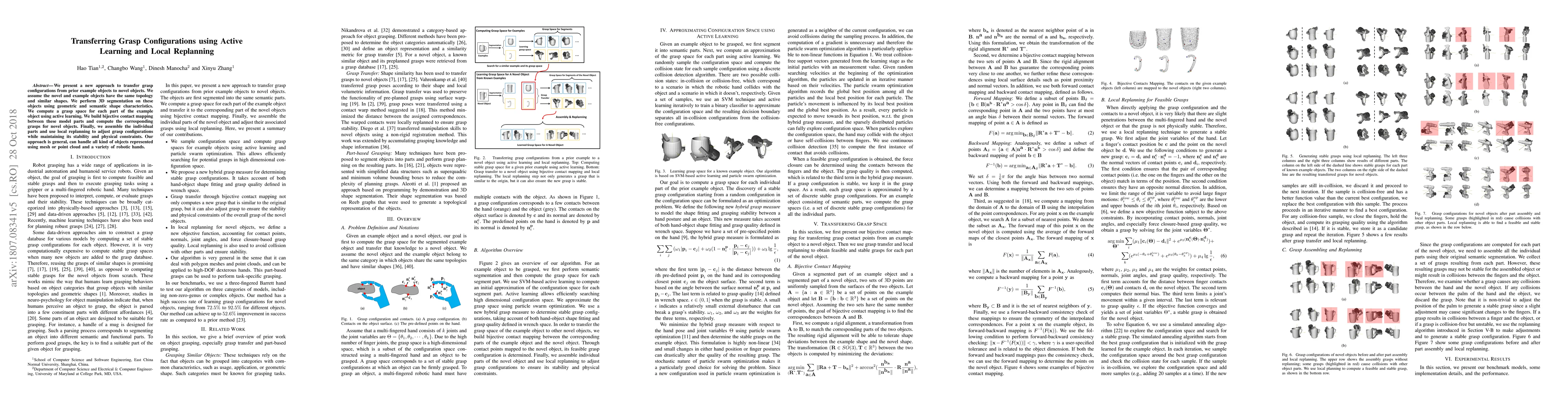 We present a new approach to transfer grasp configurations from prior example objects to novel objects. We assume the novel and example objects have the same topology and similar shapes. We perform 3D segmentation on these objects using geometric and semantic shape characteristics. We compute a grasp space for each part of the example object using active learning. We build bijective contact mapping between these model parts and compute the corresponding grasps for novel objects. Finally, we assemble the individual parts and use local replanning to adjust grasp configurations while maintaining its stability and physical constraints. Our approach is general, can handle all kind of objects represented using mesh or point cloud and a variety of robotic hands.