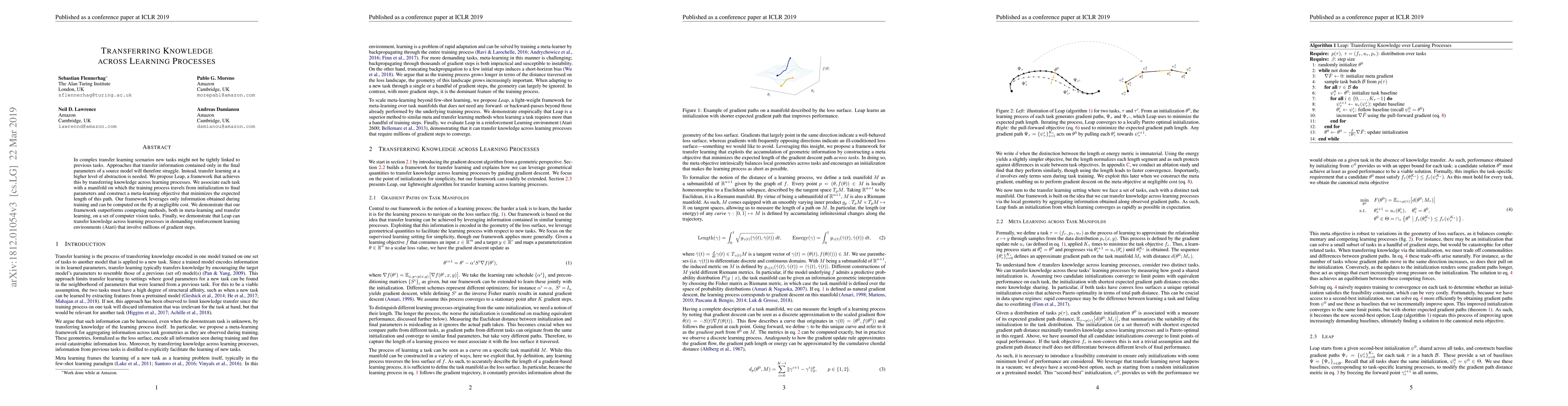 This paper introduces Leap, a framework for transfer learning that leverages knowledge across learning processes by minimizing the training path length on task-specific manifolds. It outperforms existing methods in both meta-learning and transfer learning, especially in complex reinforcement learning environments.