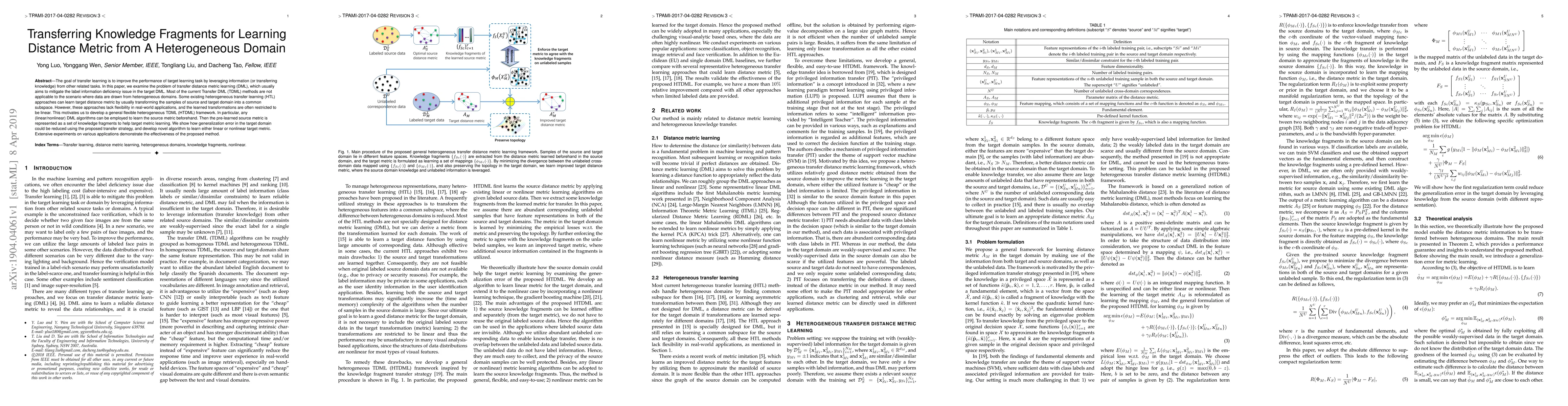 This paper proposes a flexible approach to transfer learning for distance metric learning from heterogeneous domains, enabling reduced generalization error and improved performance in target tasks.