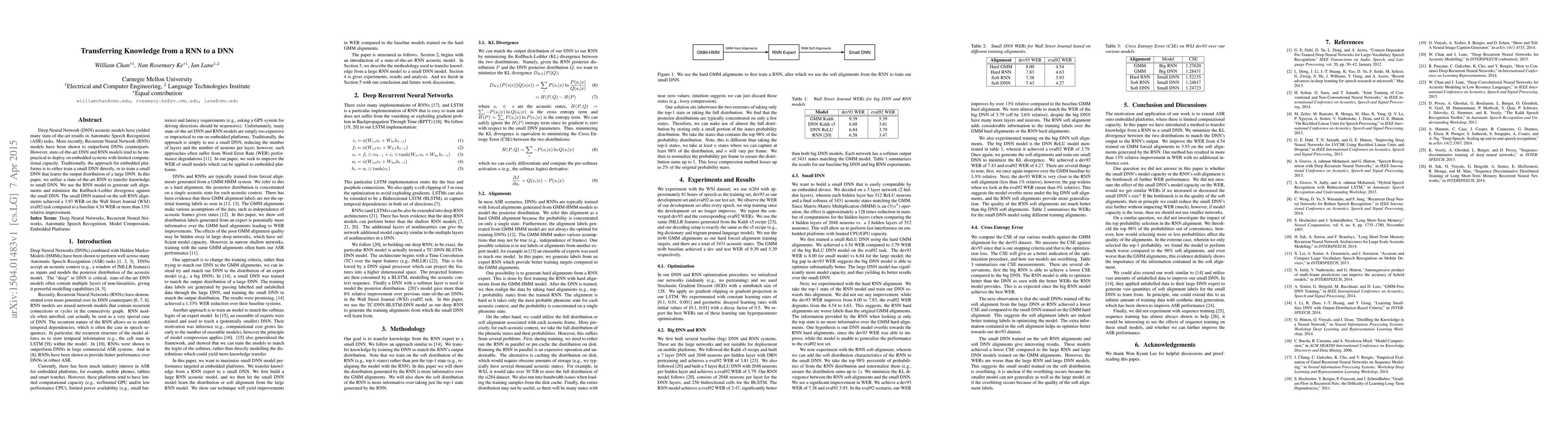 Deep Neural Network (DNN) acoustic models have yielded many state-of-the-art results in Automatic Speech Recognition (ASR) tasks. More recently, Recurrent Neural Network (RNN) models have been shown to outperform DNNs counterparts. However, state-of-the-art DNN and RNN models tend to be impractical to deploy on embedded systems with limited computational capacity. Traditionally, the approach for embedded platforms is to either train a small DNN directly, or to train a small DNN that learns the output distribution of a large DNN. In this paper, we utilize a state-of-the-art RNN to transfer knowledge to small DNN. We use the RNN model to generate soft alignments and minimize the Kullback-Leibler divergence against the small DNN. The small DNN trained on the soft RNN alignments achieved a 3.93 WER on the Wall Street Journal (WSJ) eval92 task compared to a baseline 4.54 WER or more than 13% relative improvement.