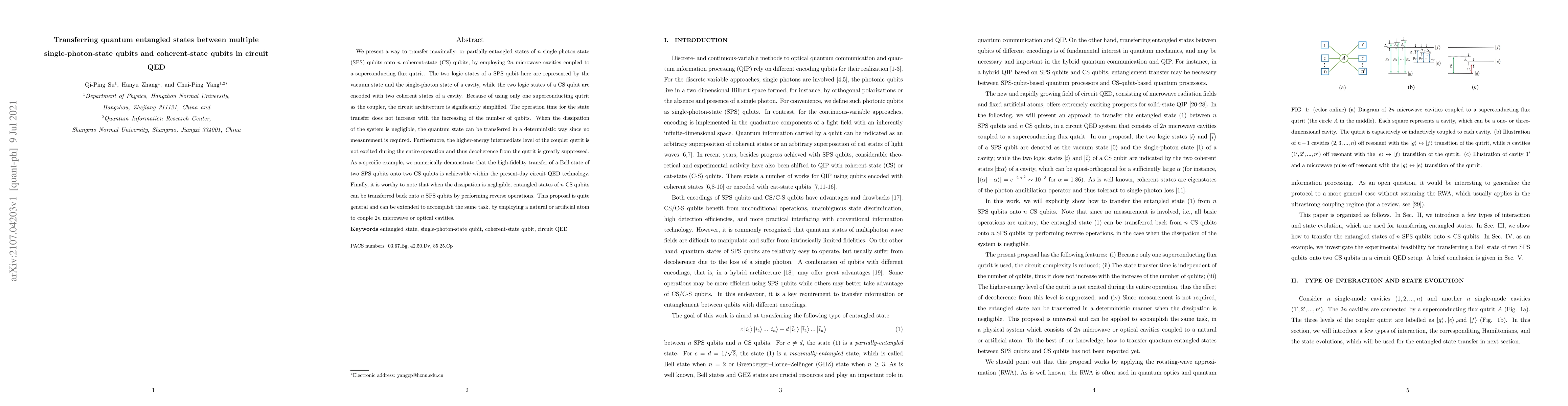 This paper proposes a method for transferring entangled states between single-photon-state qubits and coherent-state qubits using circuit QED, employing 2n microwave cavities and a superconducting flux qutrit. The architecture simplifies the process, allowing for deterministic state transfer without increasing operation time with more qubits.