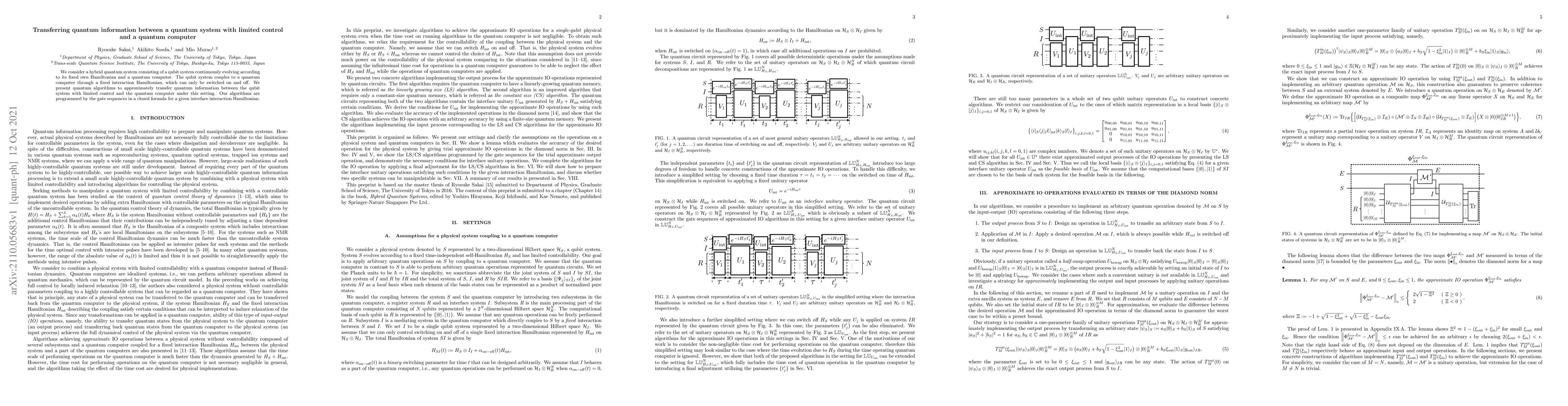 Researchers developed algorithms to transfer quantum information between a limited-control qubit system and a quantum computer, enabling approximate quantum information transfer with limited control over the interface interaction Hamiltonian.