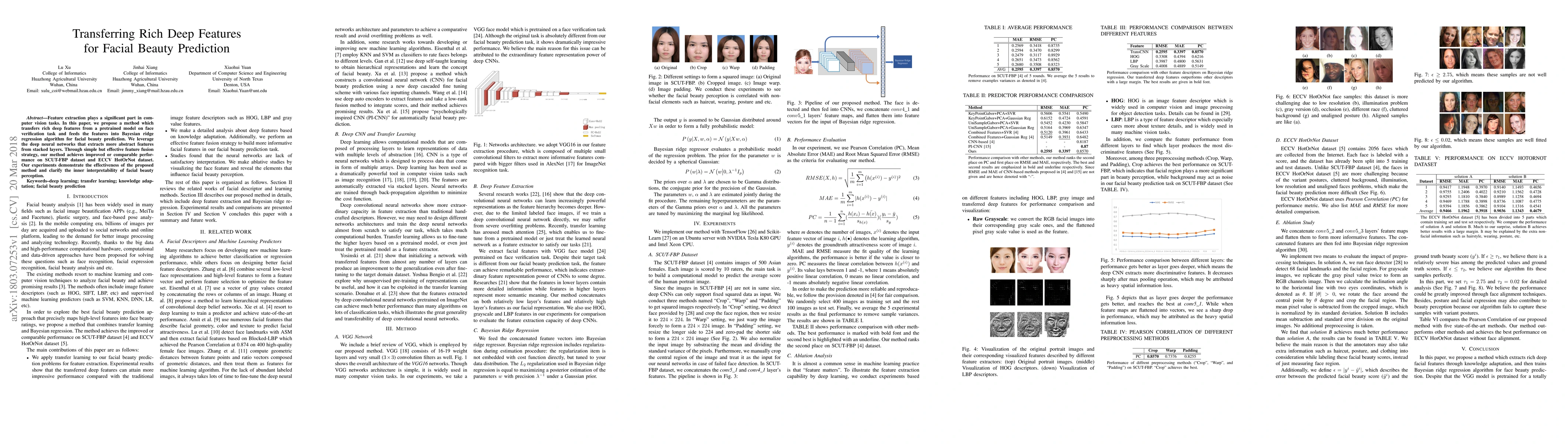 This paper proposes a method to predict facial beauty using deep features transferred from a pretrained face verification model, which are then fed into a Bayesian ridge regression algorithm. The method demonstrates improved or comparable performance on facial beauty prediction datasets, showcasing the effectiveness of the feature extraction and fusion strategy.