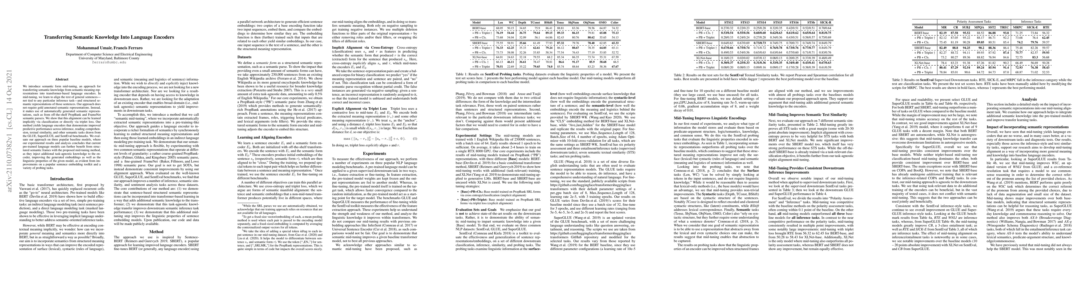 We introduce semantic form mid-tuning, an approach for transferring semantic knowledge from semantic meaning representations into transformer-based language encoders. In mid-tuning, we learn to align the text of general sentences -- not tied to any particular inference task -- and structured semantic representations of those sentences. Our approach does not require gold annotated semantic representations. Instead, it makes use of automatically generated semantic representations, such as from off-the-shelf PropBank and FrameNet semantic parsers. We show that this alignment can be learned implicitly via classification or directly via triplet loss. Our method yields language encoders that demonstrate improved predictive performance across inference, reading comprehension, textual similarity, and other semantic tasks drawn from the GLUE, SuperGLUE, and SentEval benchmarks. We evaluate our approach on three popular baseline models, where our experimental results and analysis concludes that current pre-trained language models can further benefit from structured semantic frames with the proposed mid-tuning method, as they inject additional task-agnostic knowledge to the encoder, improving the generated embeddings as well as the linguistic properties of the given model, as evident from improvements on a popular sentence embedding toolkit and a variety of probing tasks.