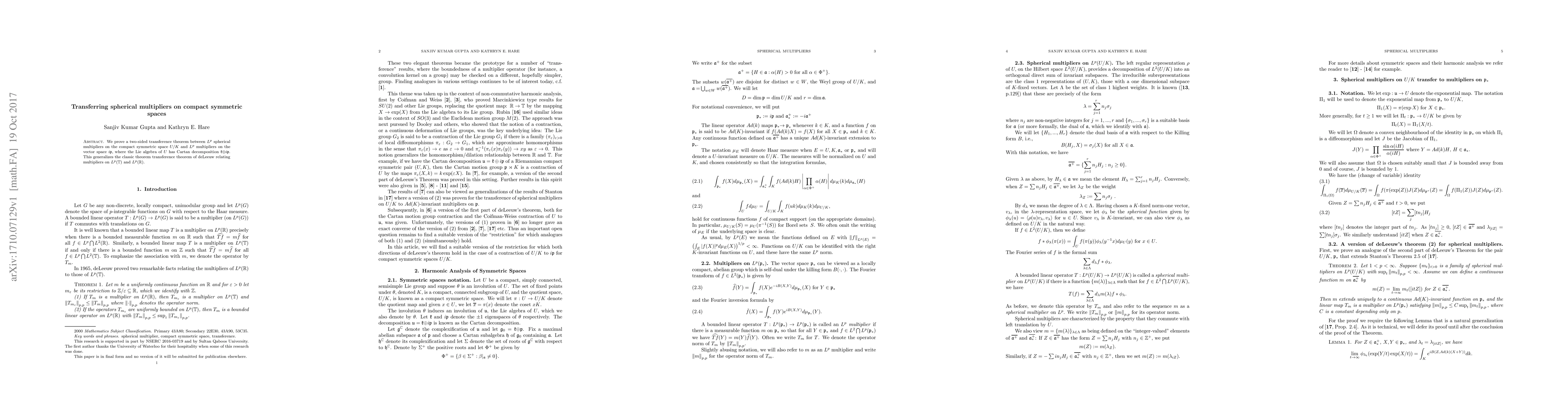 This paper proves a two-sided transference theorem for $L^{p}$ spherical multipliers on the compact symmetric space $U/K$ and $L^{p}$ multipliers on the vector space $i\mathfrak{p}$, generalizing the classical theorem of deLeeuw for multipliers on $L^{p}(\mathbb{T})$ and $L^{p}(\mathbb{R})$.