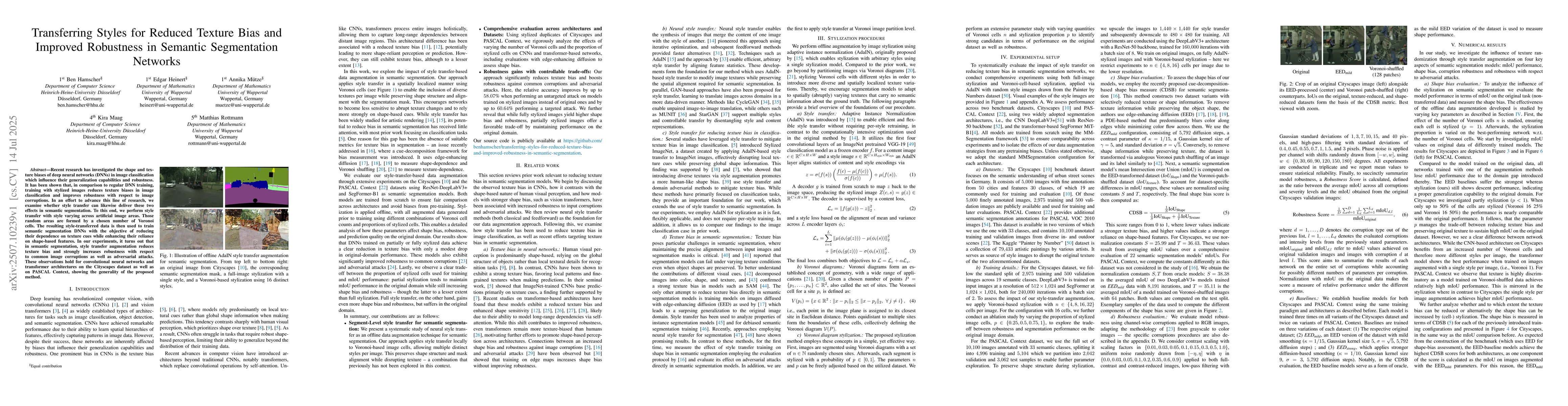Recent research has investigated the shape and texture biases of deep neural networks (DNNs) in image classification which influence their generalization capabilities and robustness. It has been shown that, in comparison to regular DNN training, training with stylized images reduces texture biases in image classification and improves robustness with respect to image corruptions. In an effort to advance this line of research, we examine whether style transfer can likewise deliver these two effects in semantic segmentation. To this end, we perform style transfer with style varying across artificial image areas. Those random areas are formed by a chosen number of Voronoi cells. The resulting style-transferred data is then used to train semantic segmentation DNNs with the objective of reducing their dependence on texture cues while enhancing their reliance on shape-based features. In our experiments, it turns out that in semantic segmentation, style transfer augmentation reduces texture bias and strongly increases robustness with respect to common image corruptions as well as adversarial attacks. These observations hold for convolutional neural networks and transformer architectures on the Cityscapes dataset as well as on PASCAL Context, showing the generality of the proposed method.