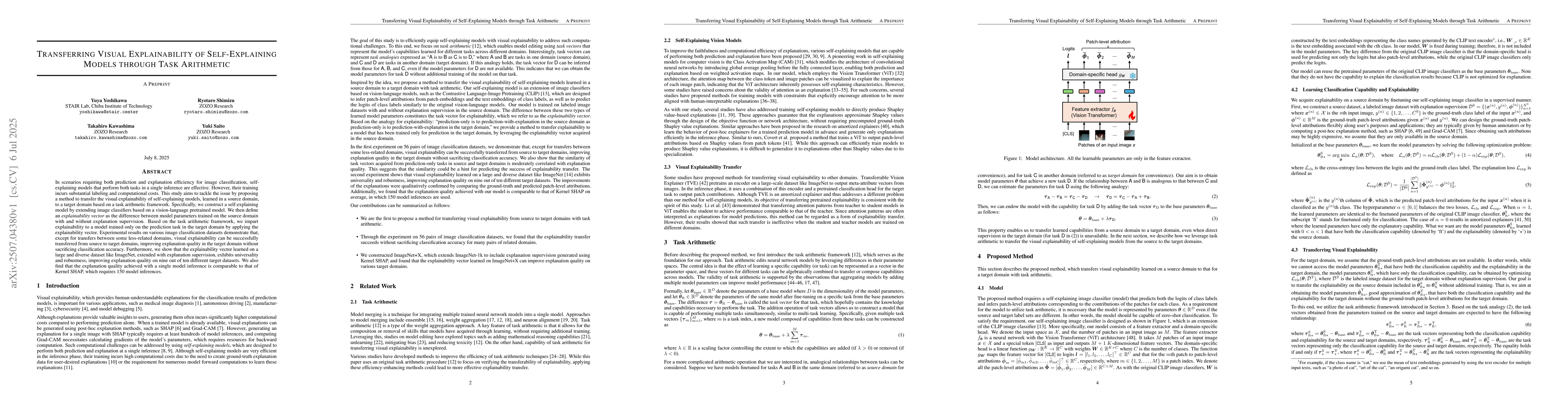 In scenarios requiring both prediction and explanation efficiency for image classification, self-explaining models that perform both tasks in a single inference are effective. However, their training incurs substantial labeling and computational costs. This study aims to tackle the issue by proposing a method to transfer the visual explainability of self-explaining models, learned in a source domain, to a target domain based on a task arithmetic framework. Specifically, we construct a self-explaining model by extending image classifiers based on a vision-language pretrained model. We then define an \emph{explainability vector} as the difference between model parameters trained on the source domain with and without explanation supervision. Based on the task arithmetic framework, we impart explainability to a model trained only on the prediction task in the target domain by applying the explainability vector. Experimental results on various image classification datasets demonstrate that, except for transfers between some less-related domains, visual explainability can be successfully transferred from source to target domains, improving explanation quality in the target domain without sacrificing classification accuracy. Furthermore, we show that the explainability vector learned on a large and diverse dataset like ImageNet, extended with explanation supervision, exhibits universality and robustness, improving explanation quality on nine out of ten different target datasets. We also find that the explanation quality achieved with a single model inference is comparable to that of Kernel SHAP, which requires 150 model inferences.