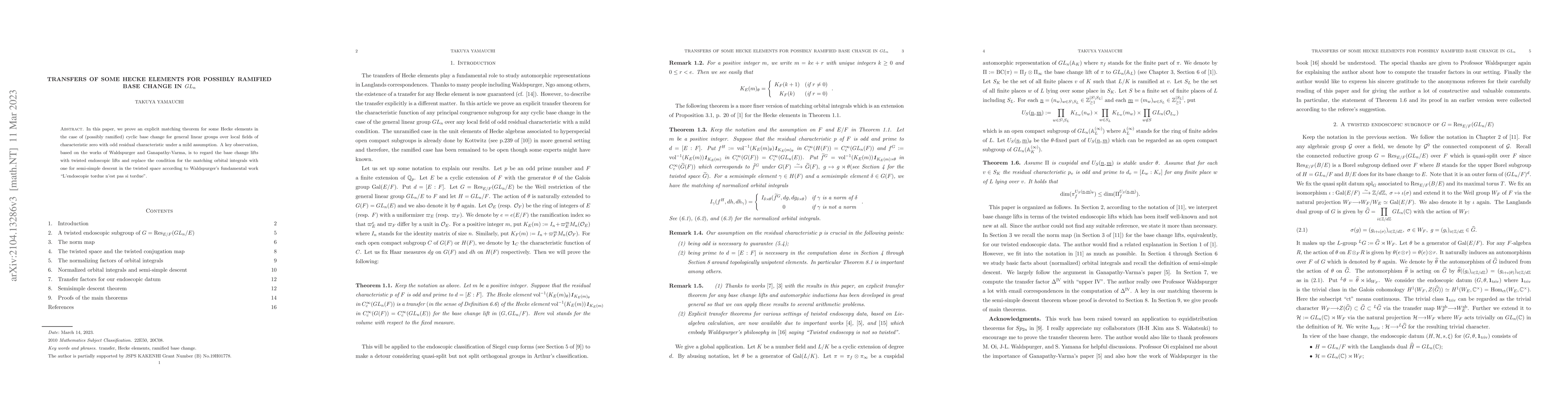 This paper establishes an explicit matching theorem for certain Hecke elements in the context of (potentially ramified) cyclic base change in general linear groups over local fields of characteristic zero with odd residue characteristic. The key insight involves linking base change lifts with twisted endoscopic lifts and adjusting the matching condition for orbital integrals to semi-simple descent in the twisted space.