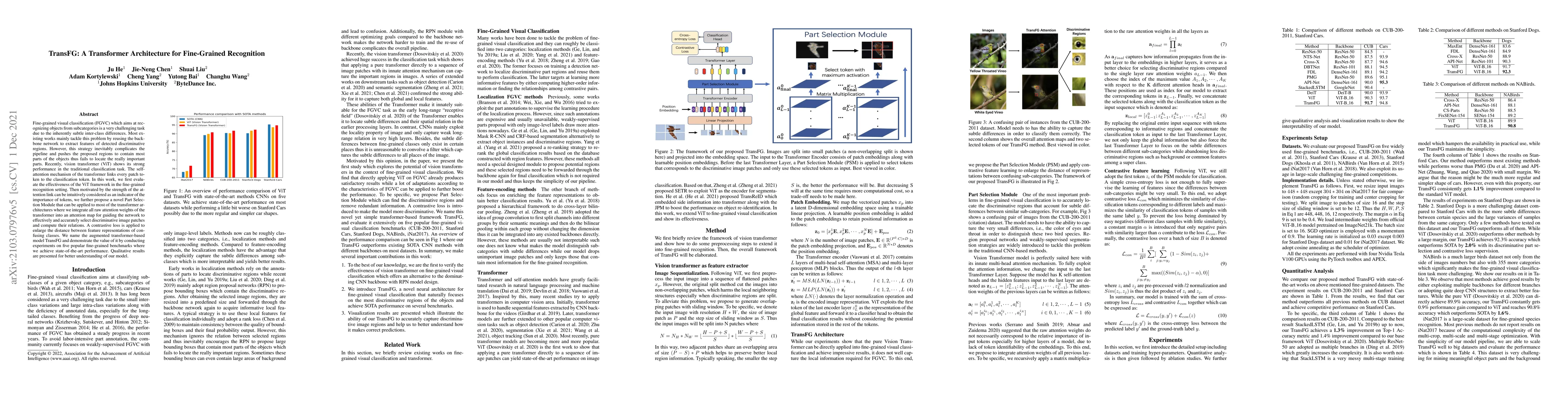 TransFG leverages the vision transformer framework for fine-grained recognition, introducing a Part Selection Module to pinpoint discriminative image patches, and employs a contrastive loss to enhance class distinction, achieving state-of-the-art results on multiple benchmarks.