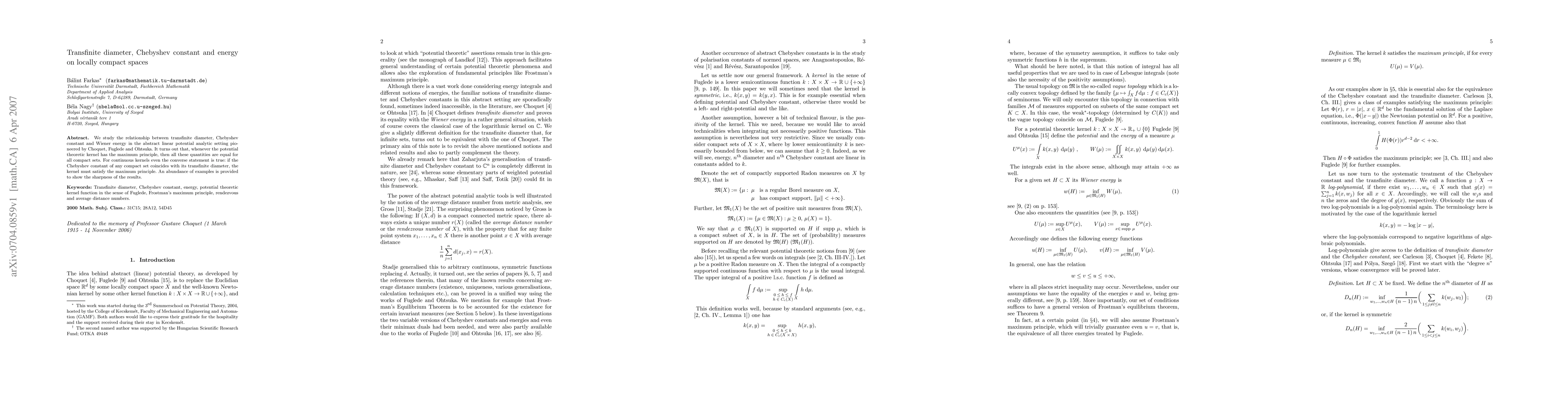 The paper investigates a relationship between transfinite diameter, Chebyshev constant, and Wiener energy in locally compact spaces with maximum principle kernel, finding that they are equal for all compact sets when the kernel satisfies this condition.