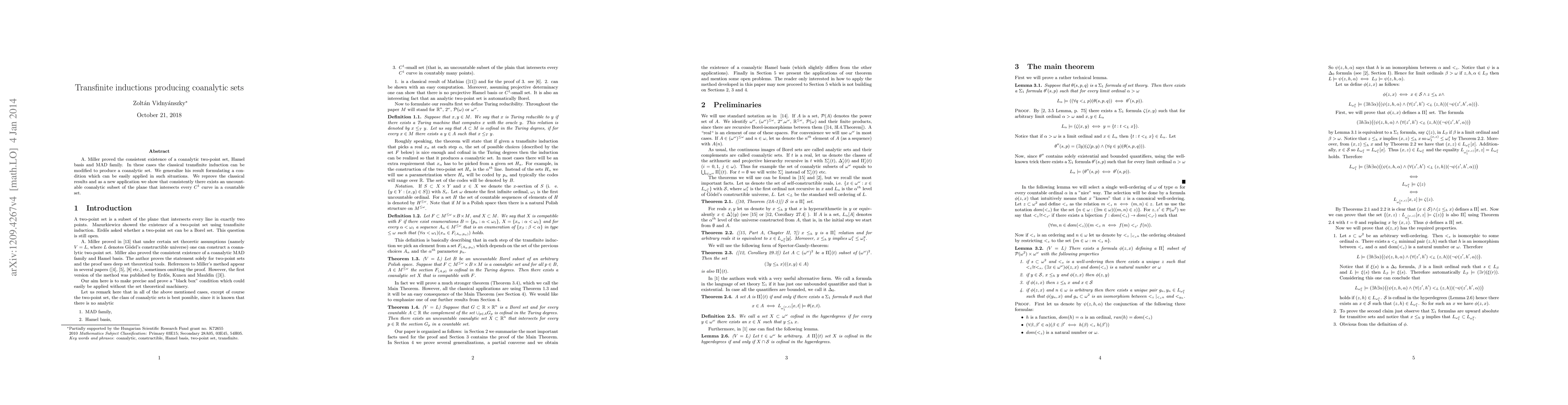 This paper generalizes the method of transfinite induction to construct coanalytic sets, building on A. Miller's work on the consistent existence of coanalytic two-point sets, Hamel basis, and MAD families. It demonstrates the existence of an uncountable coanalytic subset of the plane in $V=L$ that meets every $C^1$ curve in a countable set.