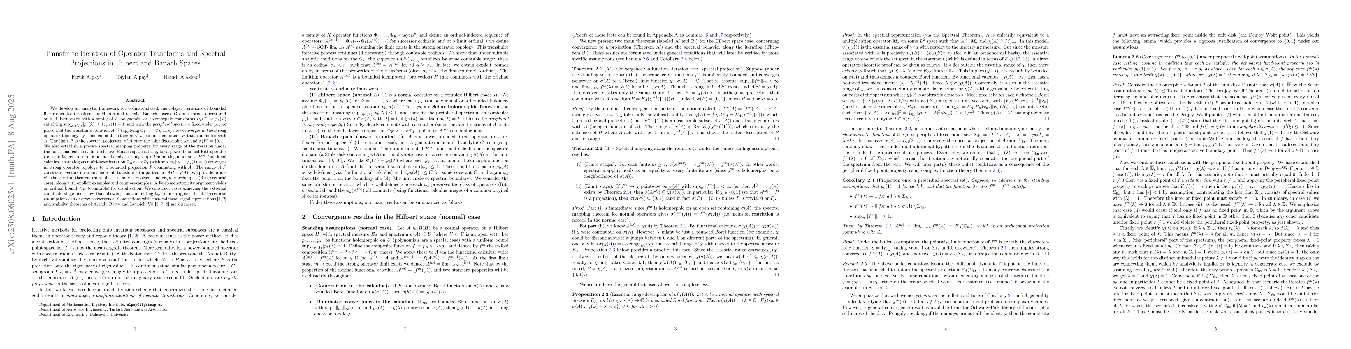 The research employs ordinal-indexed, multi-layer iterations of bounded operator transforms, proving convergence to spectral/ergodic projections under functional-calculus hypotheses. It examines normal operators on Hilbert space and contractive layers that fix only the peripheral spectrum at fixed points, showing strong operator topology convergence by a countable stage.