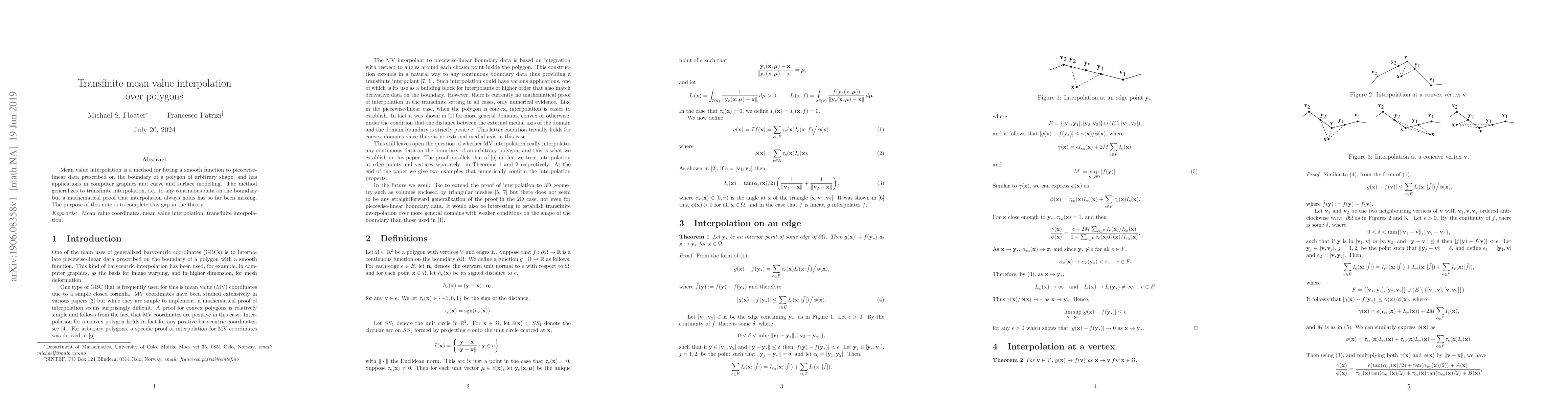 This paper develops a mathematical proof for mean value interpolation over arbitrary polygon boundaries, generalizing the method to transfinite interpolation for continuous boundary data, thereby addressing a longstanding theoretical gap in its application. The method has significant implications for computer graphics and surface modelling.