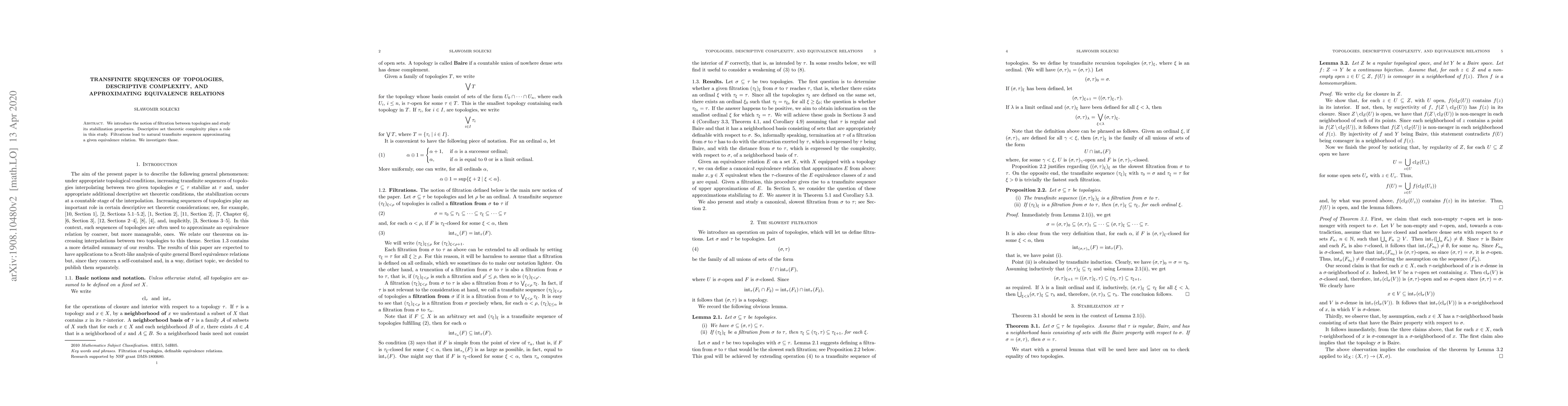 Researchers introduce a concept of filtration between topologies to study stabilization properties and their role in approximating equivalence relations. They explore how these filtrations lead to natural transfinite sequences with descriptive complexity implications.
