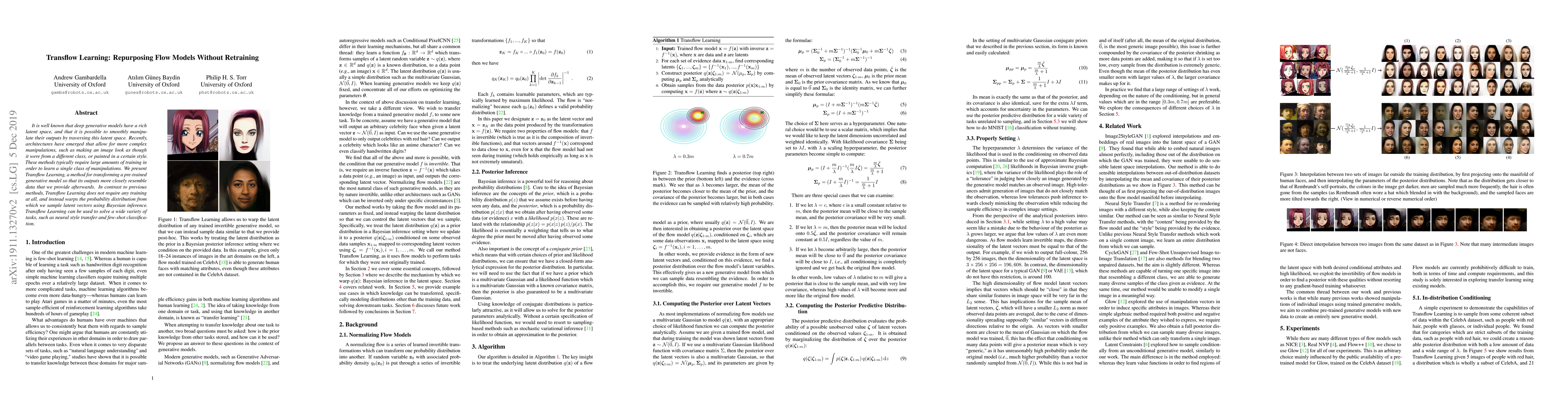 Transflow Learning enables the repurposing of pre-trained generative models for various tasks without requiring retraining, instead using Bayesian inference to warp the latent space. This method facilitates neural style transfer and few-shot classification efficiently.