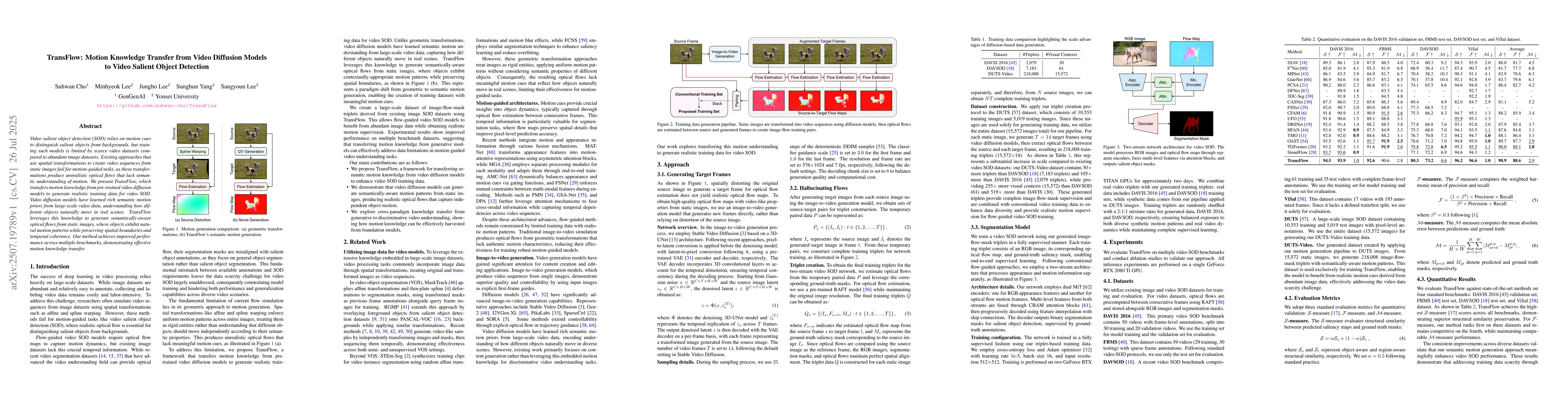 Video salient object detection (SOD) relies on motion cues to distinguish salient objects from backgrounds, but training such models is limited by scarce video datasets compared to abundant image datasets. Existing approaches that use spatial transformations to create video sequences from static images fail for motion-guided tasks, as these transformations produce unrealistic optical flows that lack semantic understanding of motion. We present TransFlow, which transfers motion knowledge from pre-trained video diffusion models to generate realistic training data for video SOD. Video diffusion models have learned rich semantic motion priors from large-scale video data, understanding how different objects naturally move in real scenes. TransFlow leverages this knowledge to generate semantically-aware optical flows from static images, where objects exhibit natural motion patterns while preserving spatial boundaries and temporal coherence. Our method achieves improved performance across multiple benchmarks, demonstrating effective motion knowledge transfer.